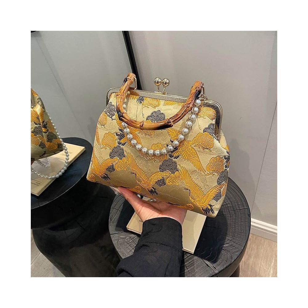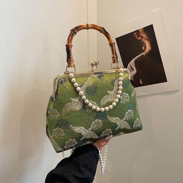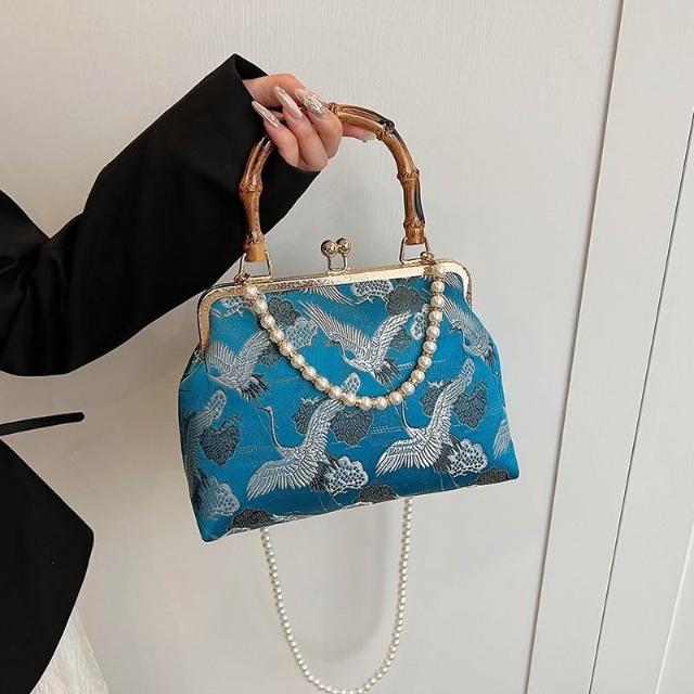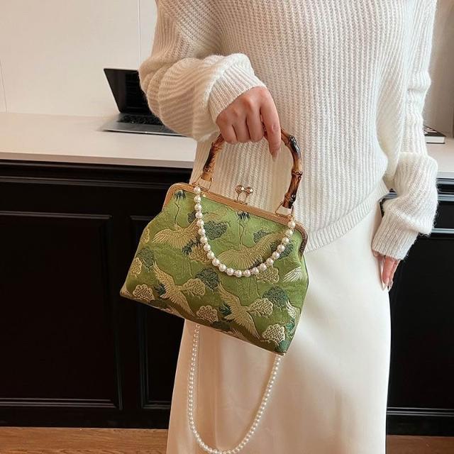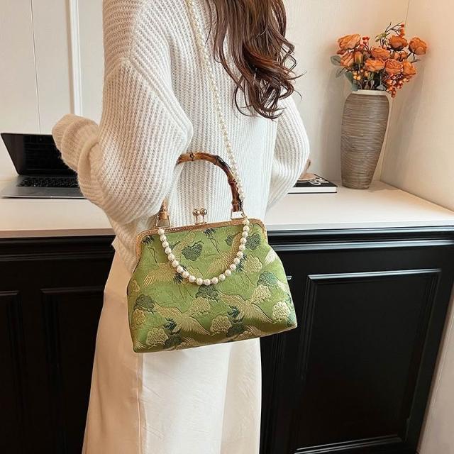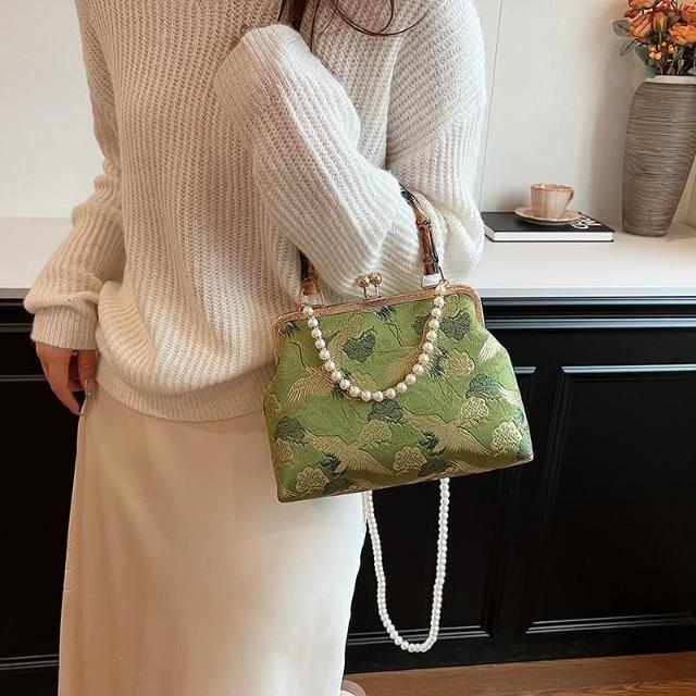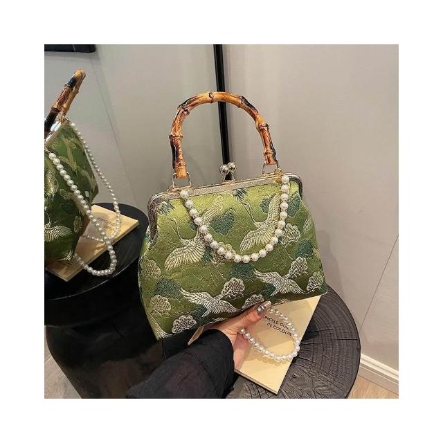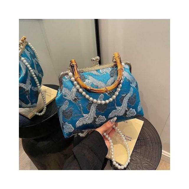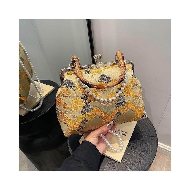 BG流行時尚新中式國風刺繡竹節手拎包潮流百搭小衆口金包珍珠鏈條女包包