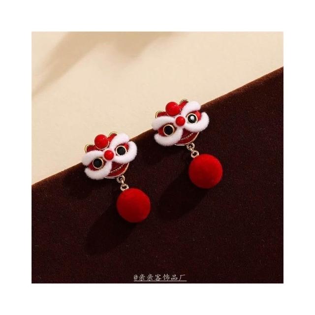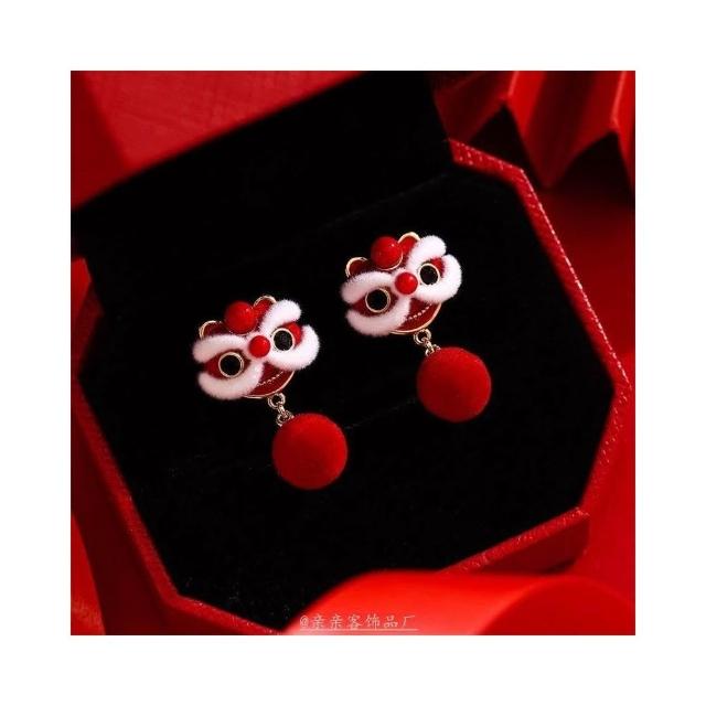 BG流行時尚紅色醒獅耳環女耳夾新中式國風適合過年戴的耳飾新年喜慶絲絨耳釘