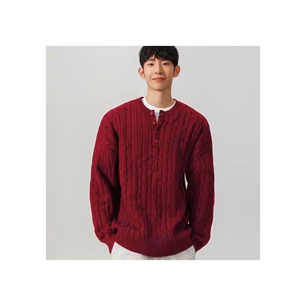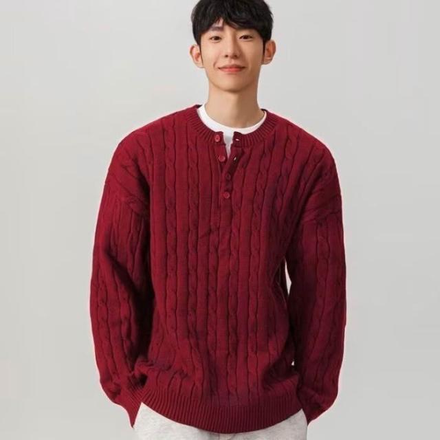 本命年紅色亨利領毛衣男士款秋冬爆款慵懶風鬆弛感麻花針織衫外套