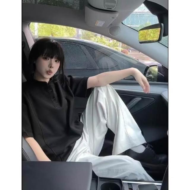 美式亨利領Polo衫男 正肩Boxy拼接短袖 黑色痞帥質感上衣 半截袖潮流訂製tee