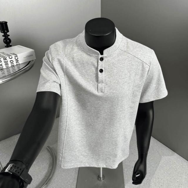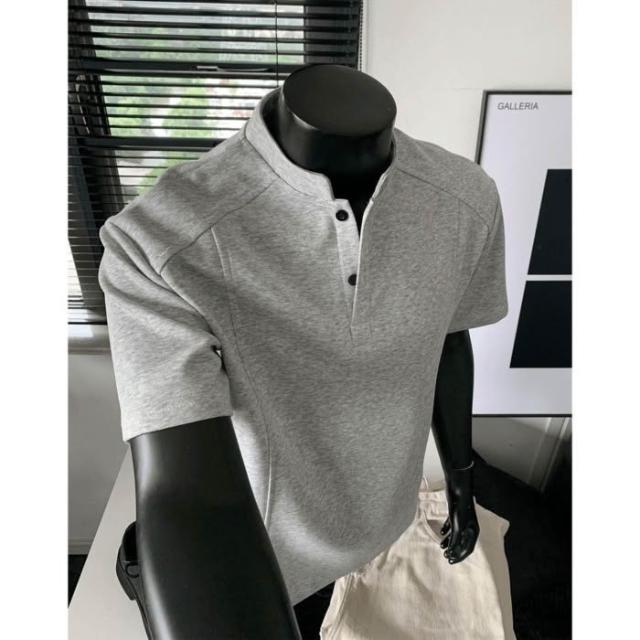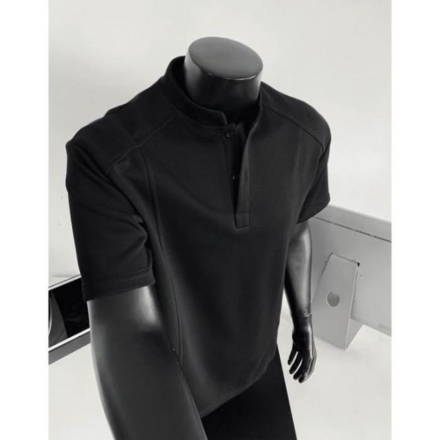 美式亨利領Polo衫男 正肩Boxy拼接短袖 黑色痞帥質感上衣 半截袖潮流訂製tee