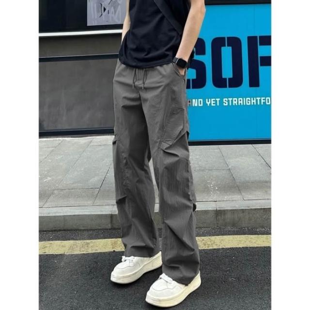 卡其色冰絲工裝褲男 夏季速乾薄款傘兵褲 微喇褶皺設計 32腰身高彈力休閒神褲