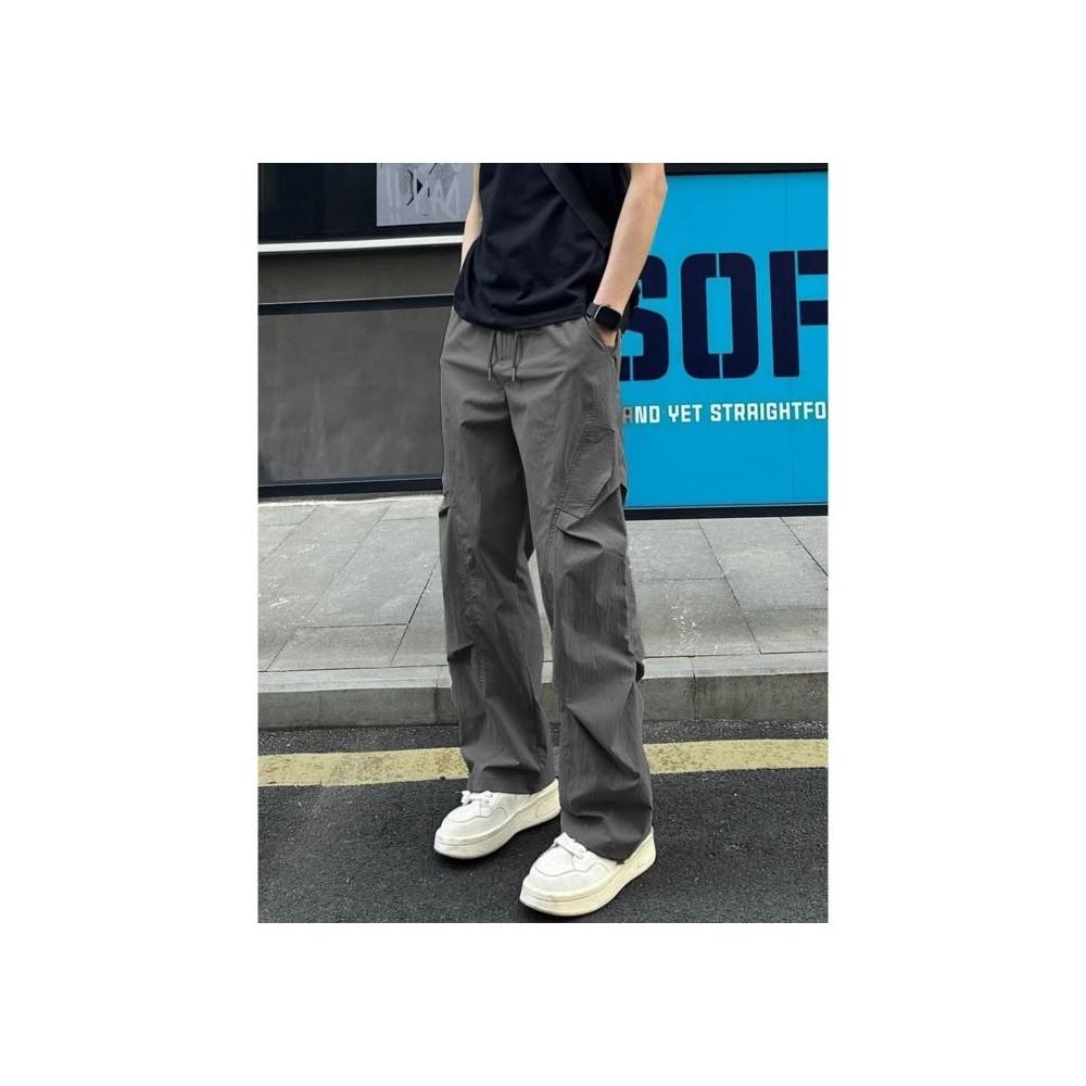 卡其色冰絲工裝褲男 夏季速乾薄款傘兵褲 微喇褶皺設計 32腰身高彈力休閒神褲