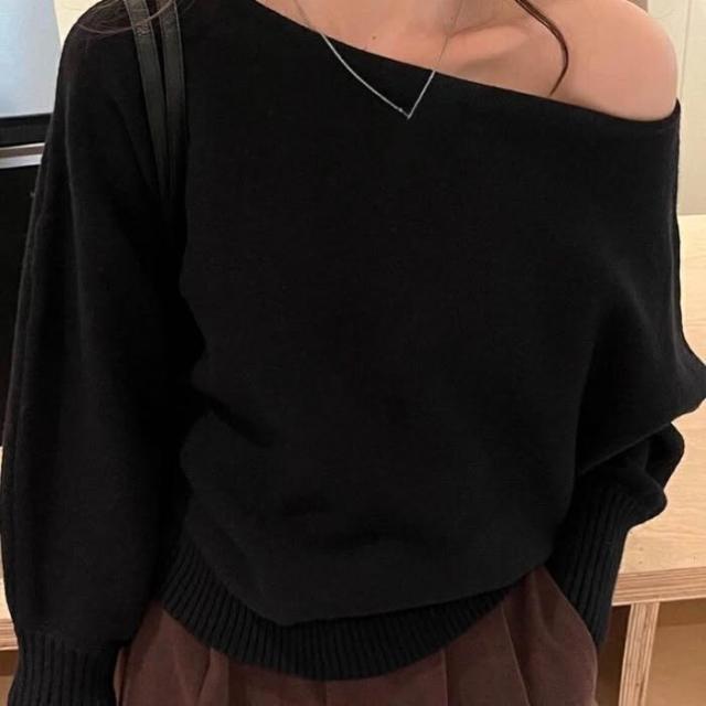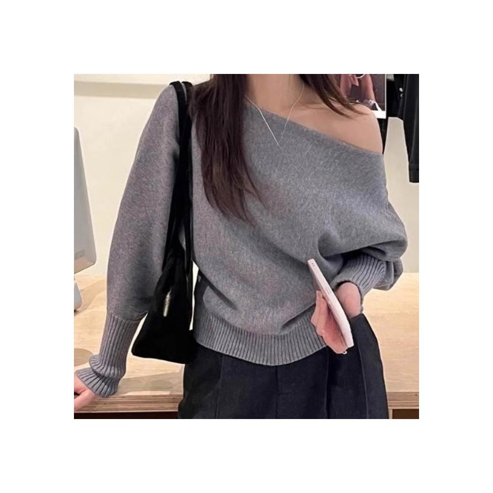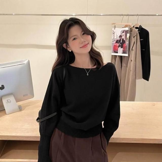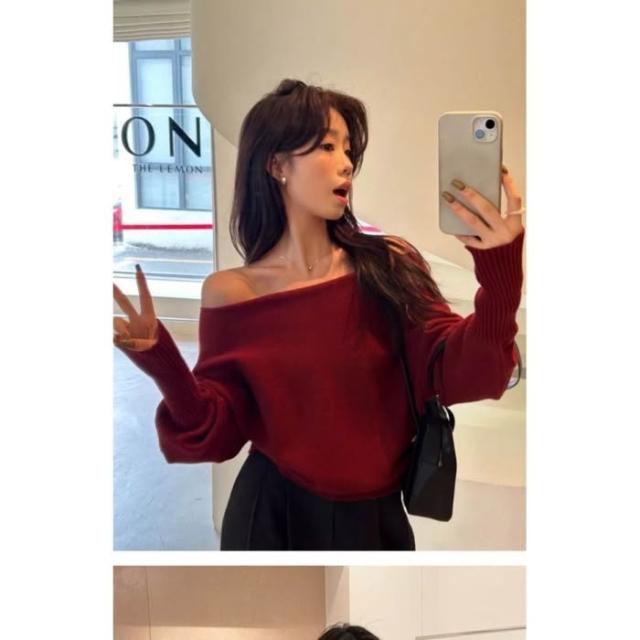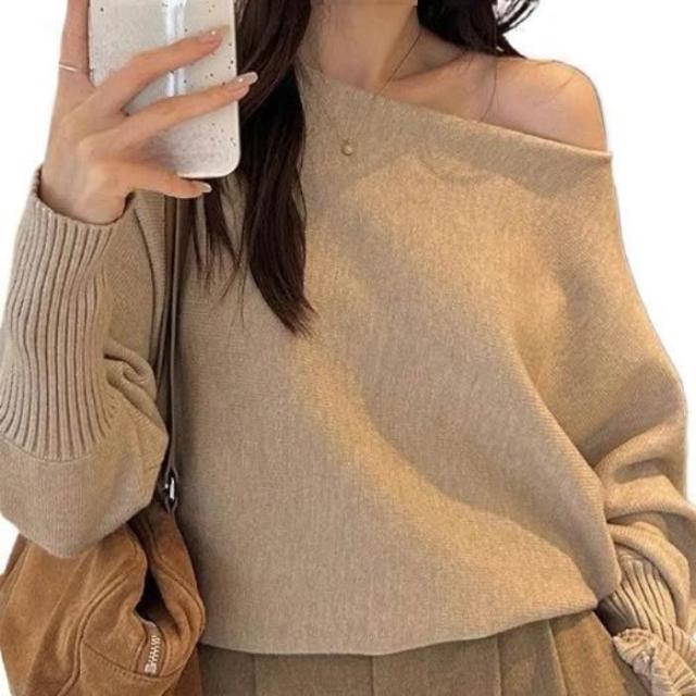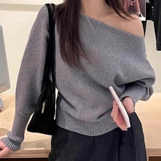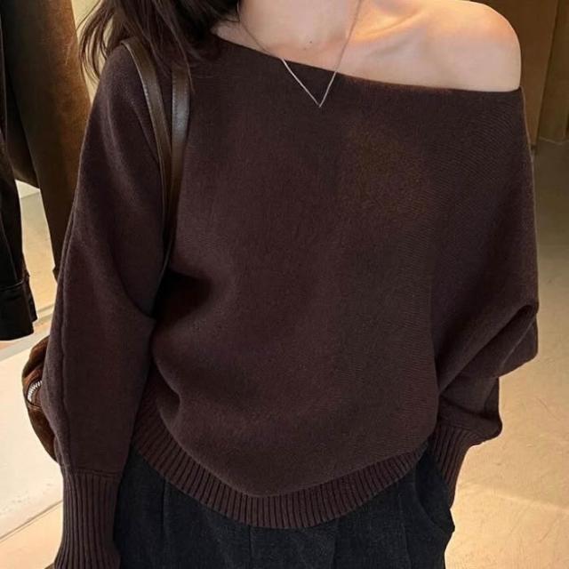 女裝一字領露肩軟糯毛衣2025秋季新款純色套頭針織衫花灰黑色