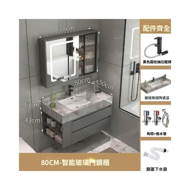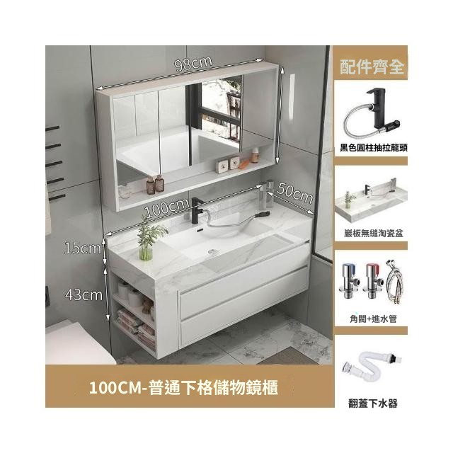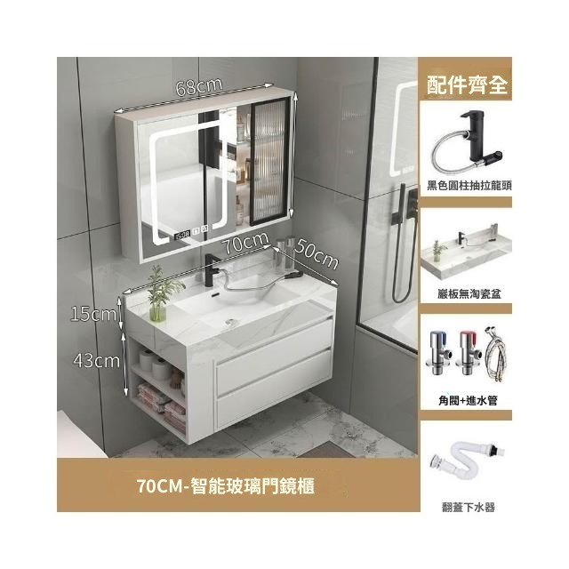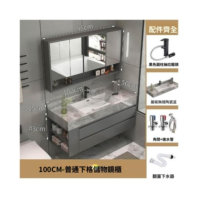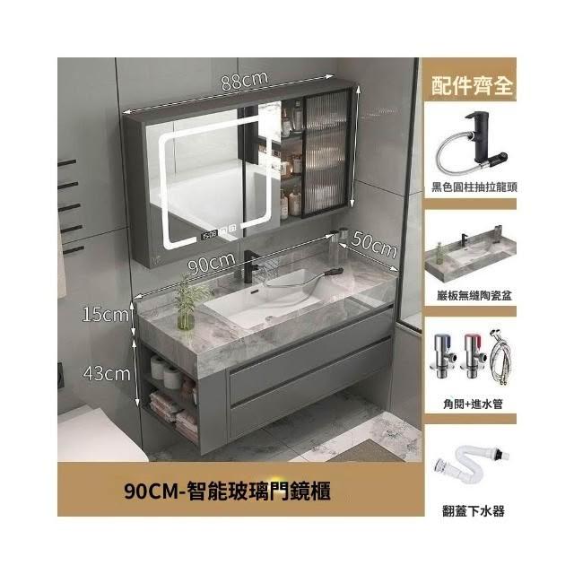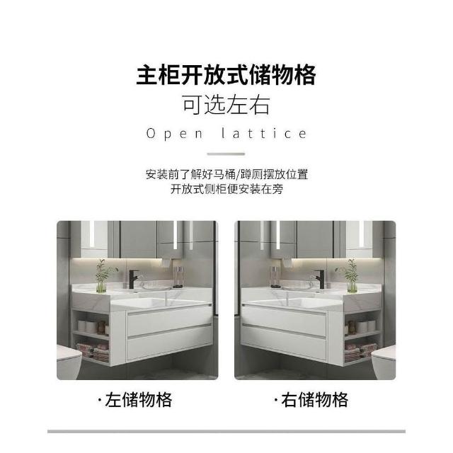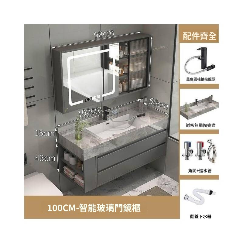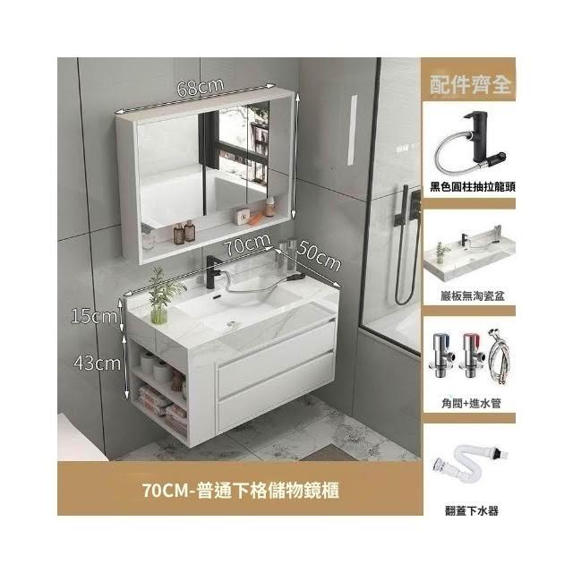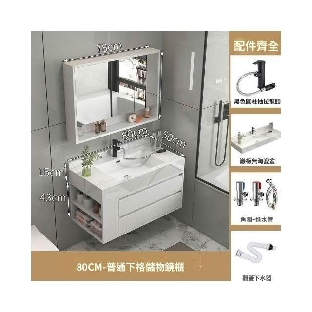 浴室櫃組合 岩板無縫陶瓷一體盆 帶鏡子 送抽拉龍頭 防水防污 衛浴洗手台 洗臉盆櫃 收納邊櫃 浴室櫃