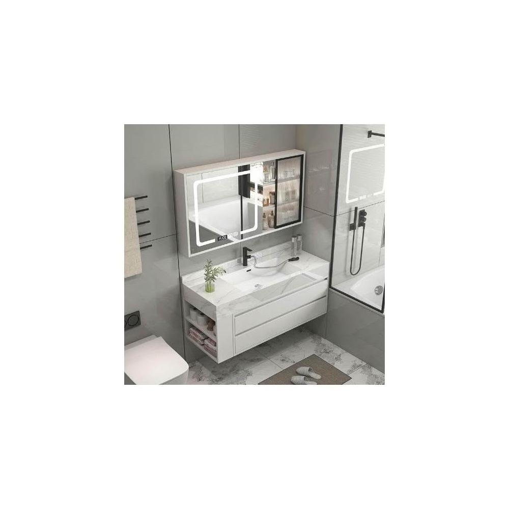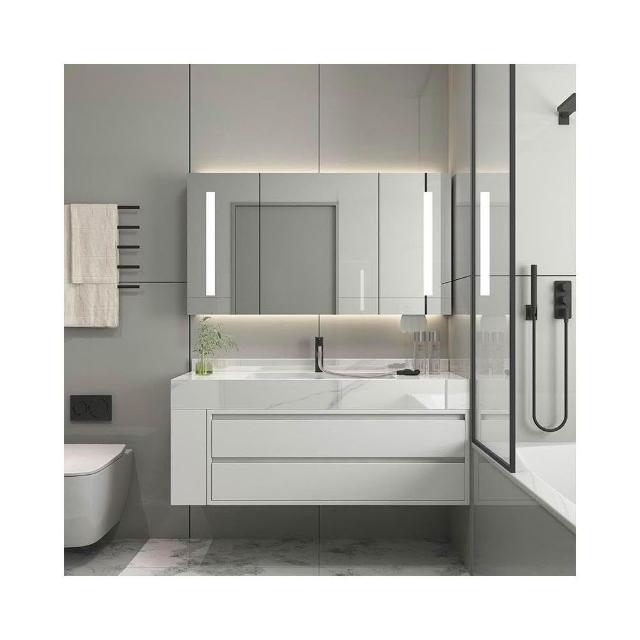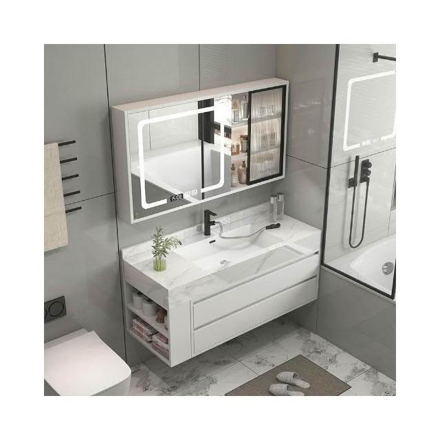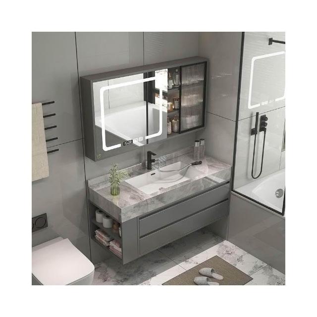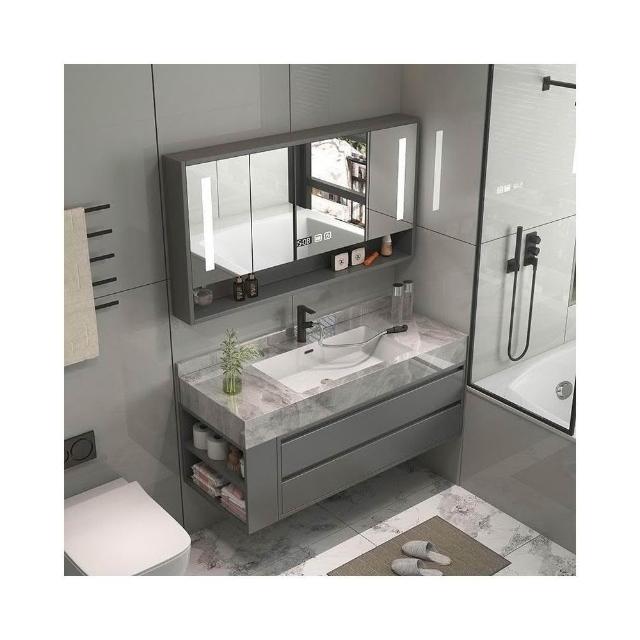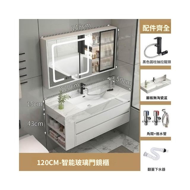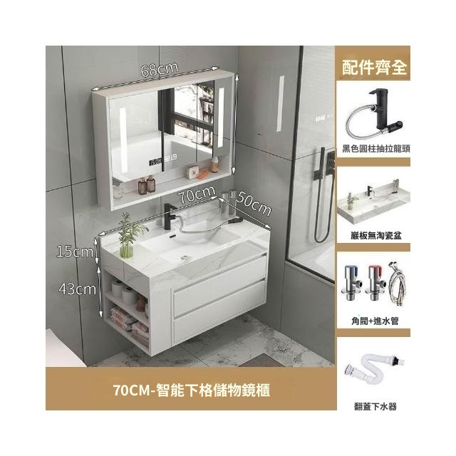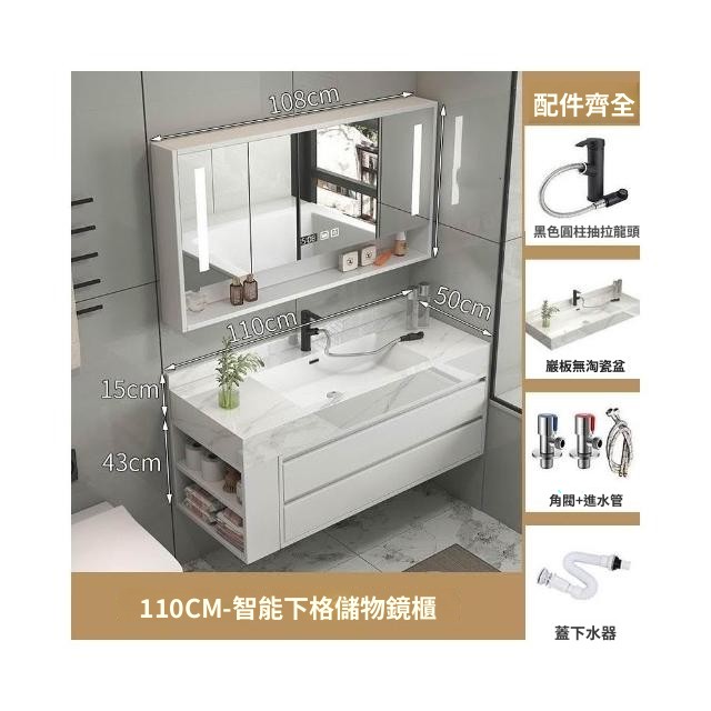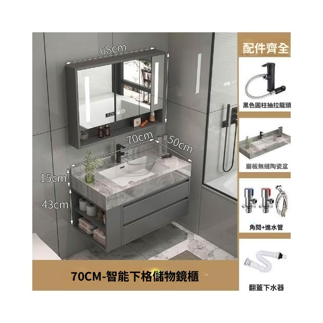 浴室櫃組合 岩板無縫陶瓷一體盆 帶鏡子 送抽拉龍頭 防水防污 衛浴洗手台 洗臉盆櫃 收納邊櫃 浴室櫃