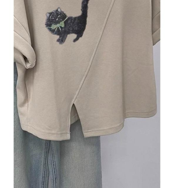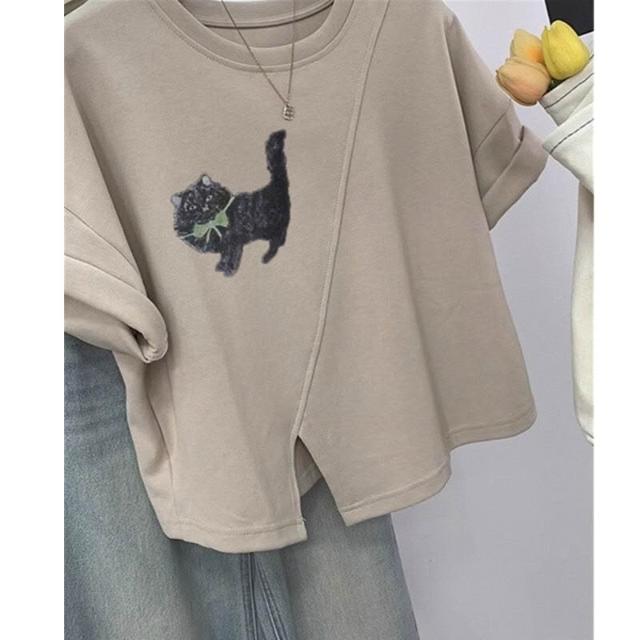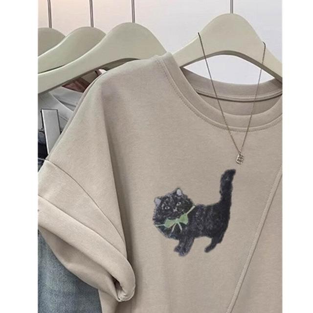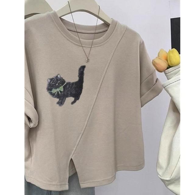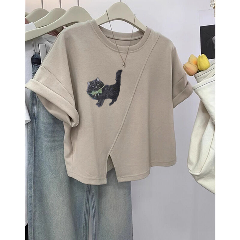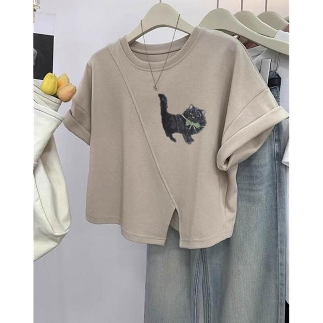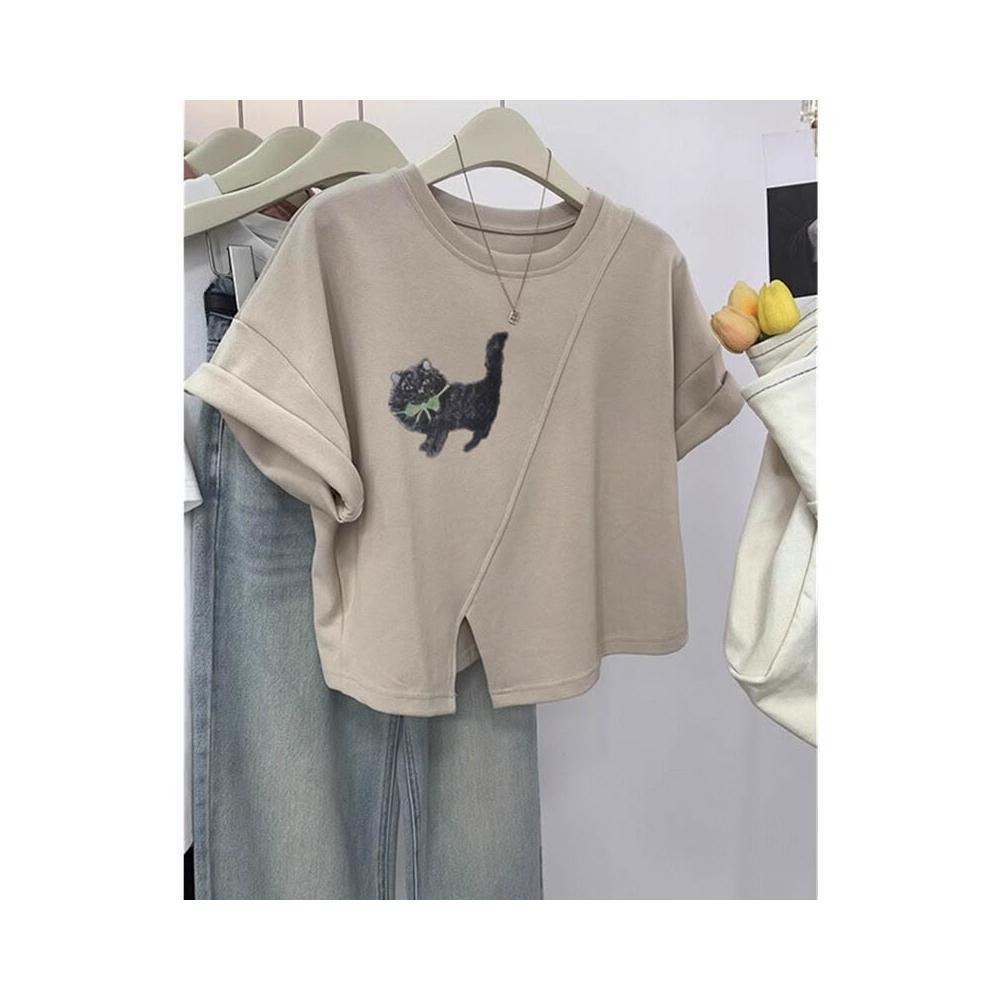 Quality生活 貓咪印花正肩短袖t恤女夏季設計感小眾小個子不規則寬松半袖上衣 00d