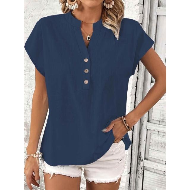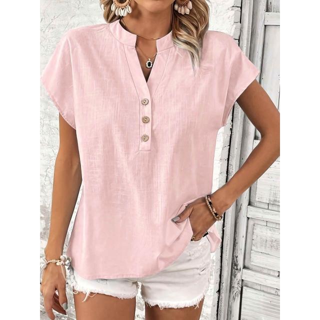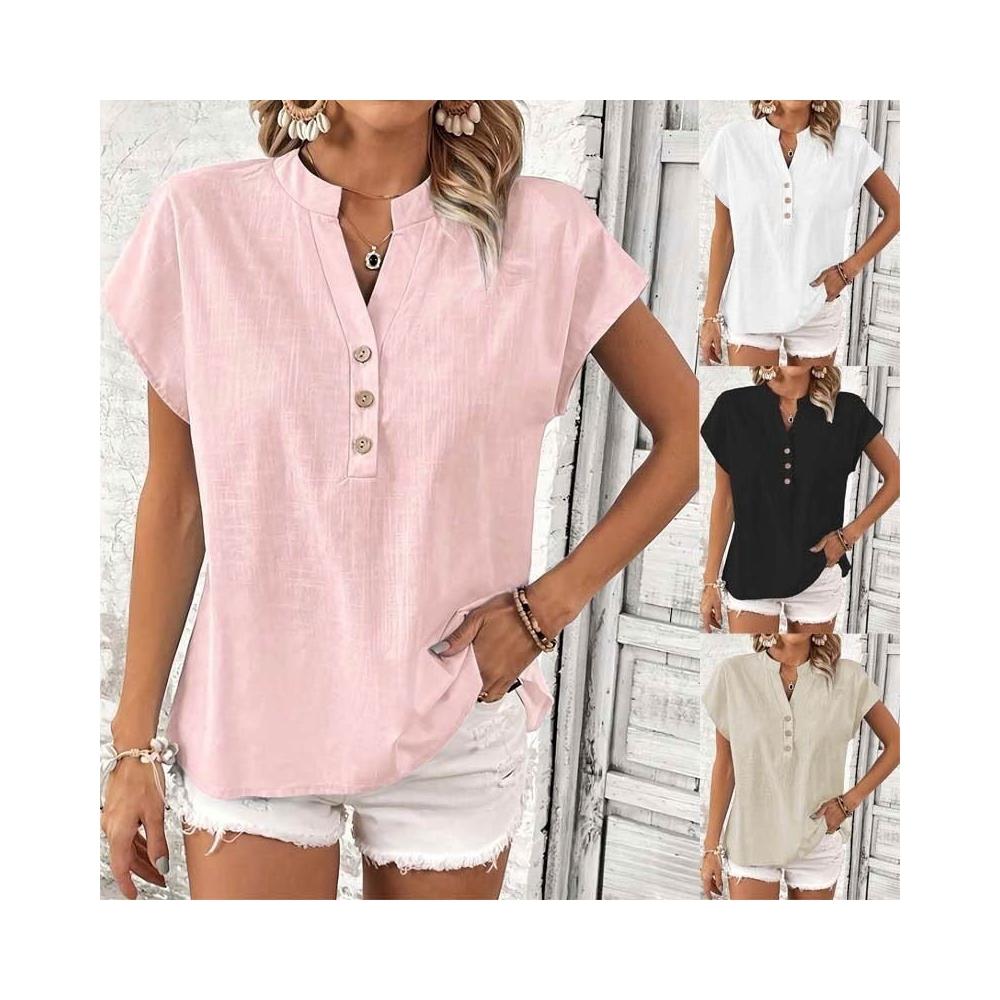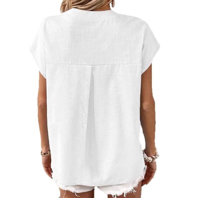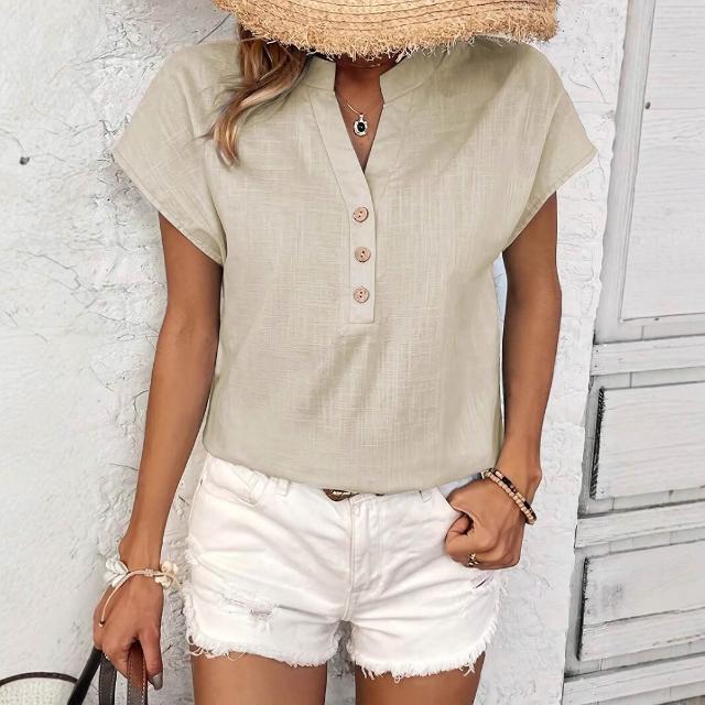 Quality生活 2026新款復古棉麻女士休閑襯衫 V領紐扣短袖純色棉麻上衣 cf8