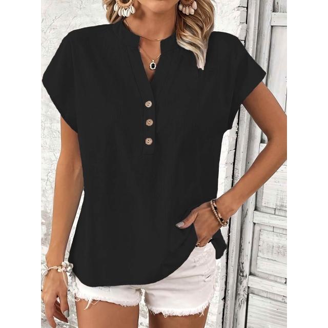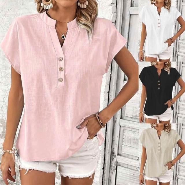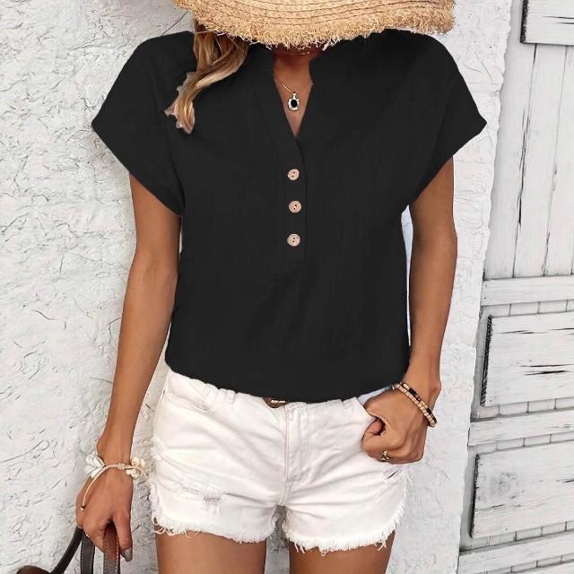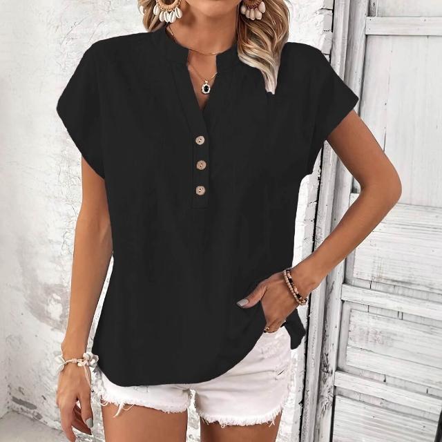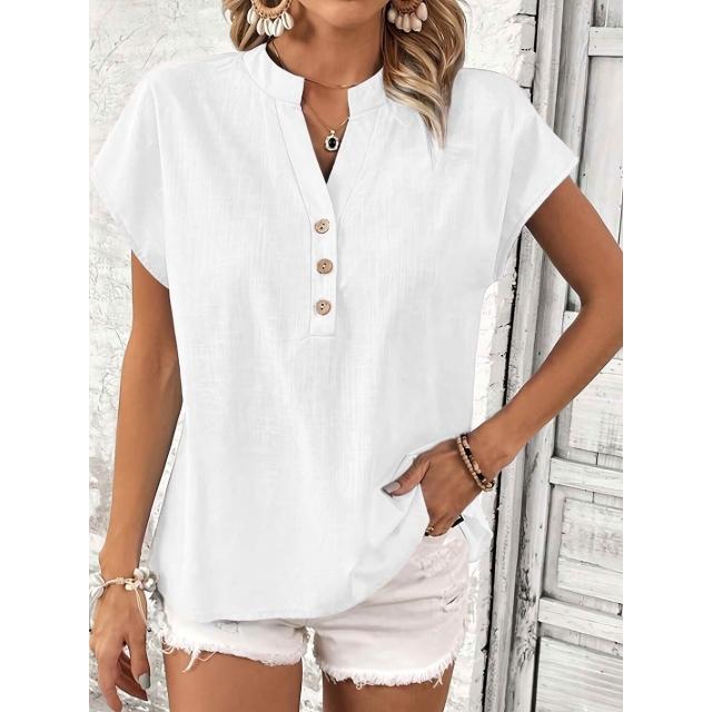 Quality生活 2026新款復古棉麻女士休閑襯衫 V領紐扣短袖純色棉麻上衣 cf8