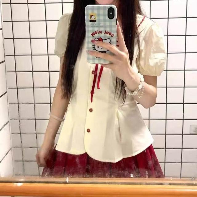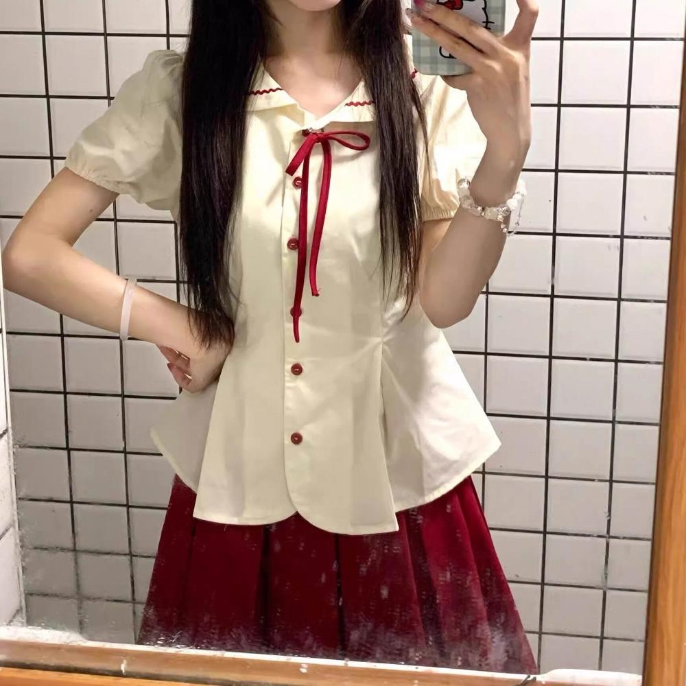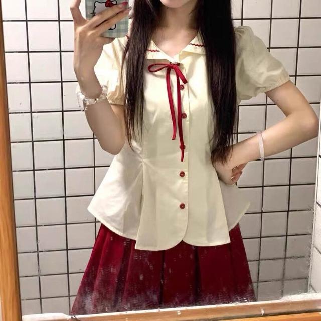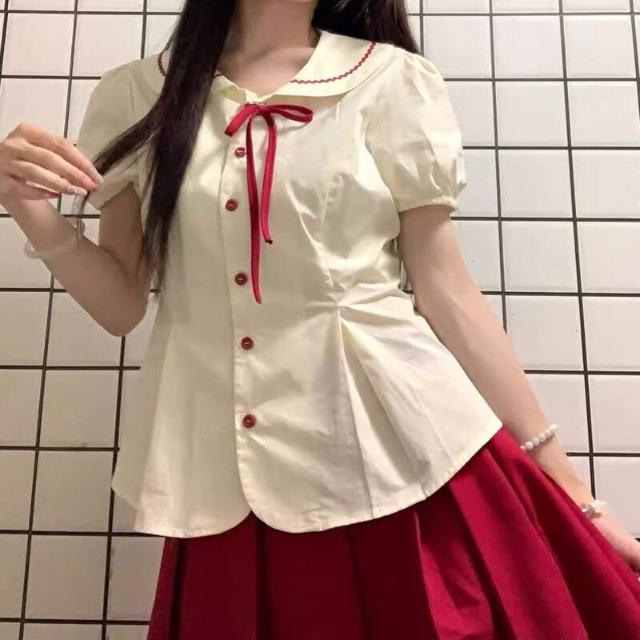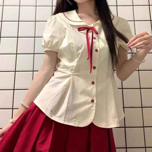 Quality生活 娃娃領短袖襯衫女夏季蝴蝶結綁帶撞色襯衣外套學院風甜美修身上衣 f04