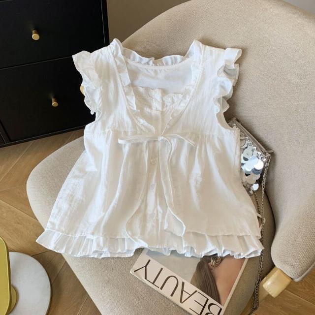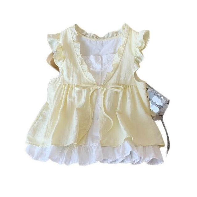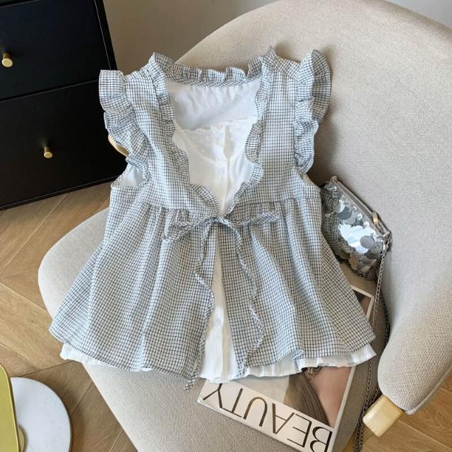 Quality生活 韓系格子假兩件襯衫女邊減齡寬松無袖娃娃衫背心上衣 7dc
