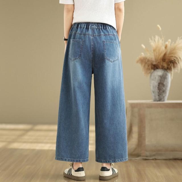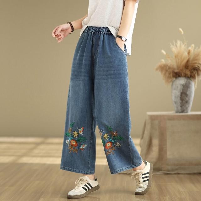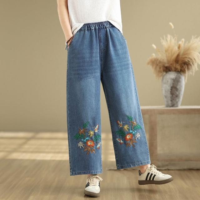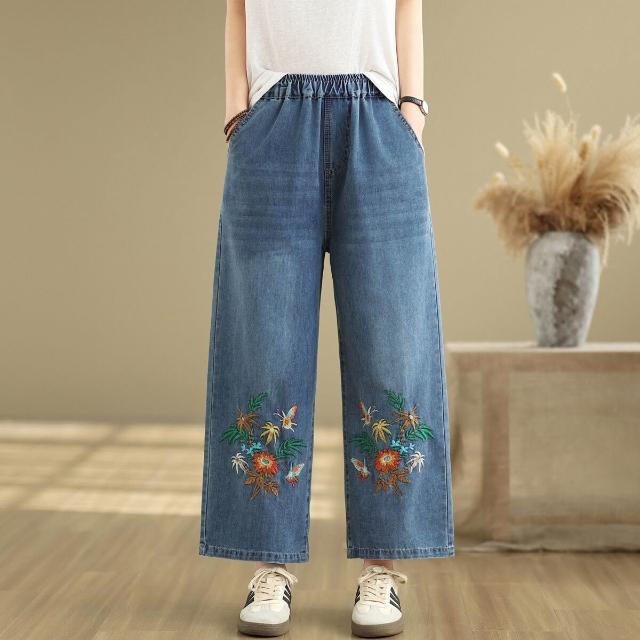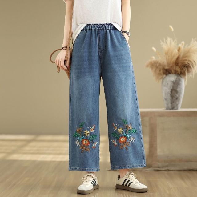 Quality生活 復古刺繡九分闊腿牛仔褲女春夏顯瘦八分褲寬松直筒褲小個子九分褲 52a