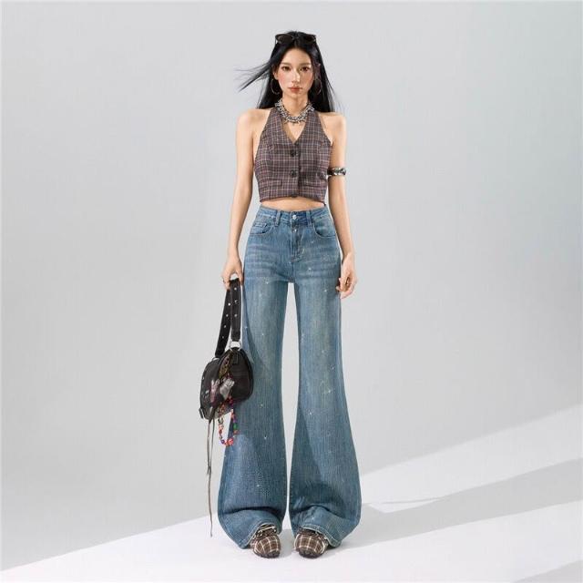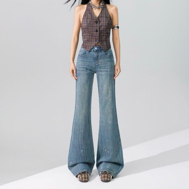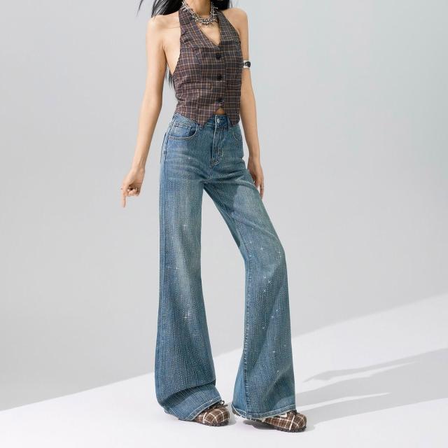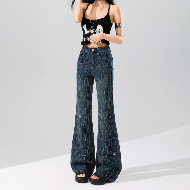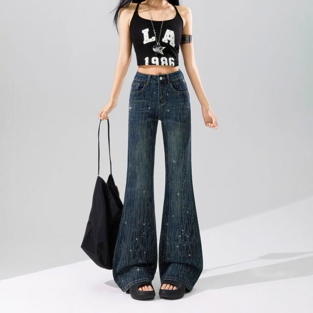 Quality生活 滿天星燙鉆爆閃不貼腿微喇牛仔褲女2026春款柔軟舒適寬松喇叭褲子 9d8