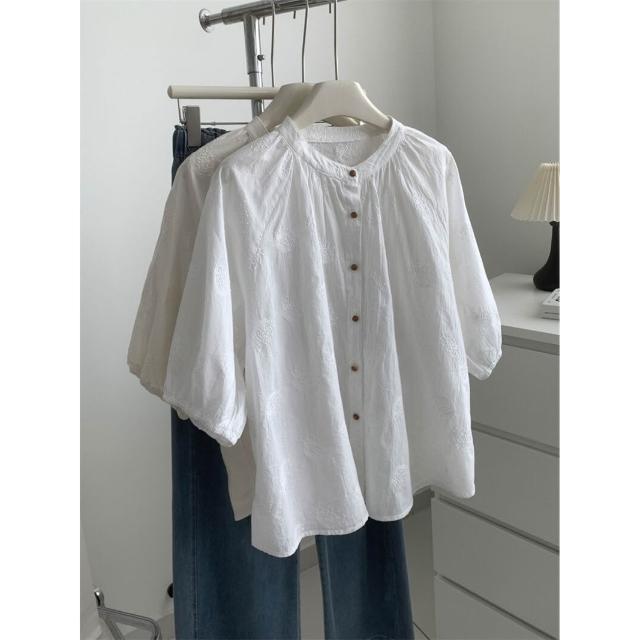 Quality生活 法式復古水洗棉提花圓領半袖小衫女韓系百搭插肩袖襯衫短袖襯衣夏 da0