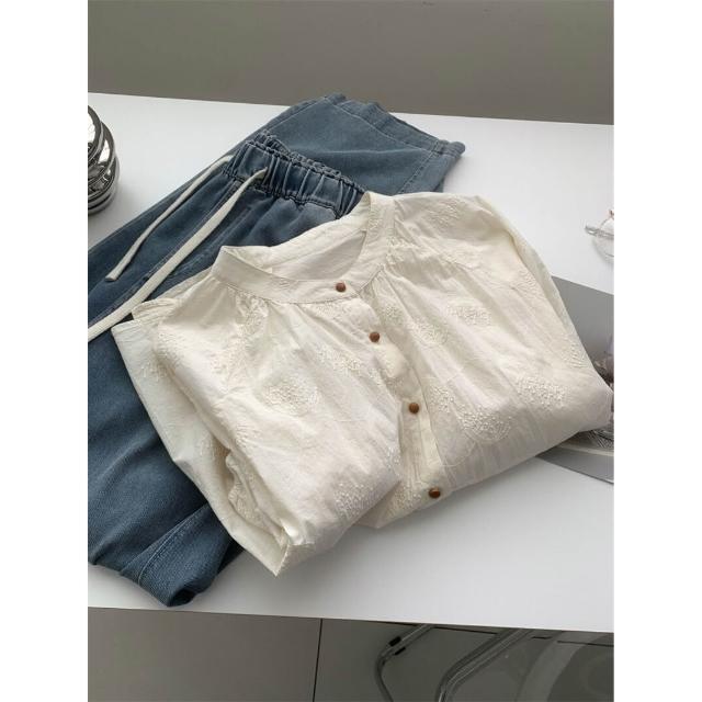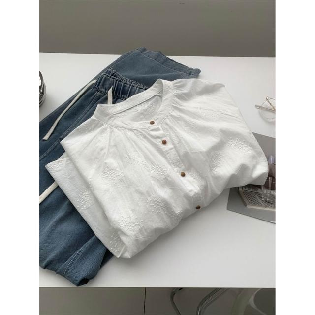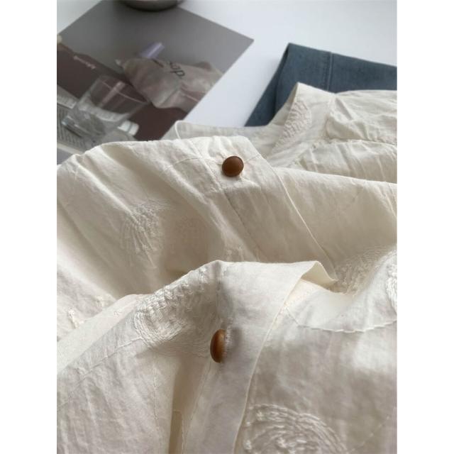 Quality生活 法式復古水洗棉提花圓領半袖小衫女韓系百搭插肩袖襯衫短袖襯衣夏 da0