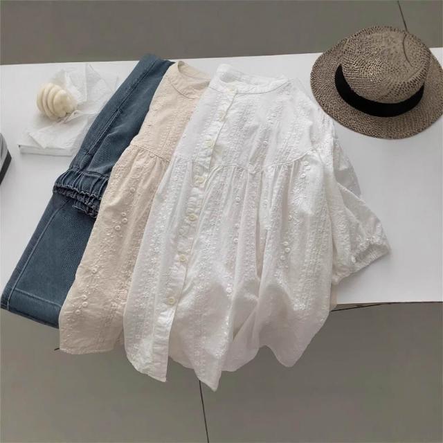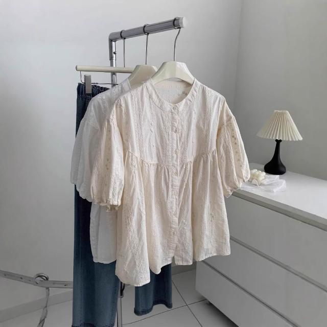 Quality生活 重工刺繡圓領拼接短袖娃娃衫女法式復古小衫夏季甜美減齡半袖襯衫 dd9