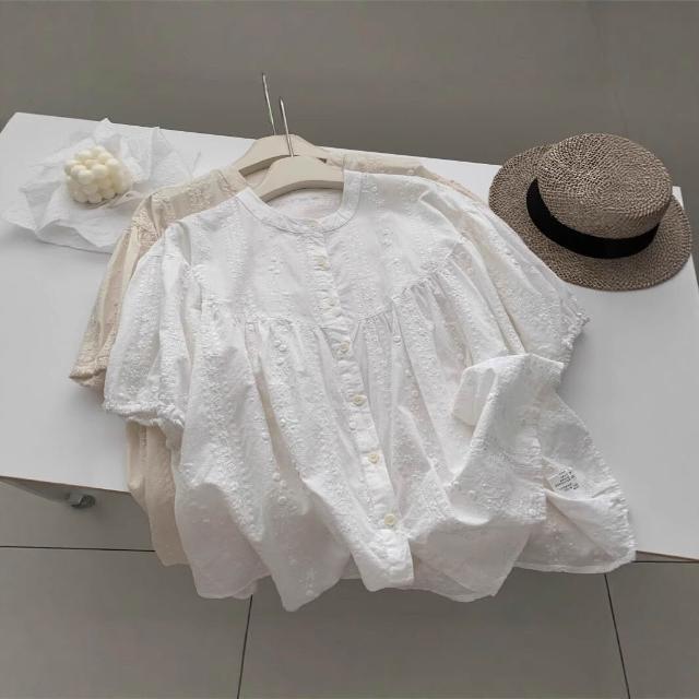 Quality生活 重工刺繡圓領拼接短袖娃娃衫女法式復古小衫夏季甜美減齡半袖襯衫 dd9