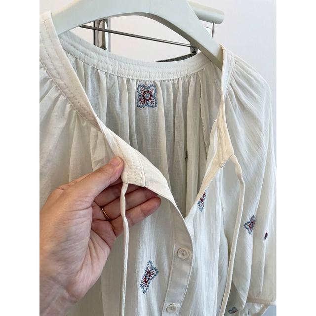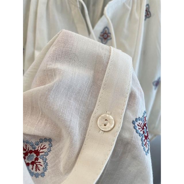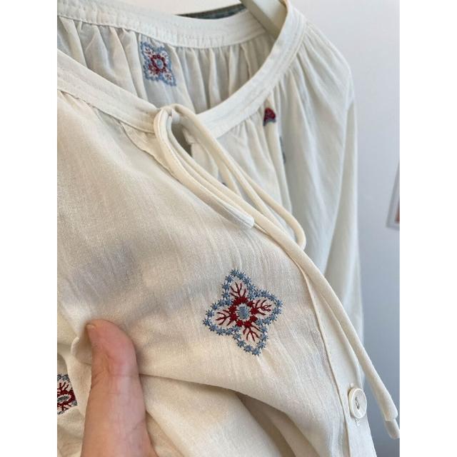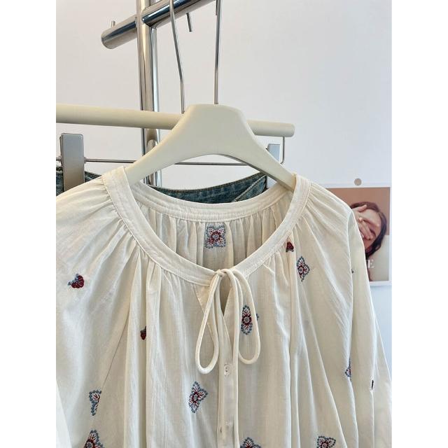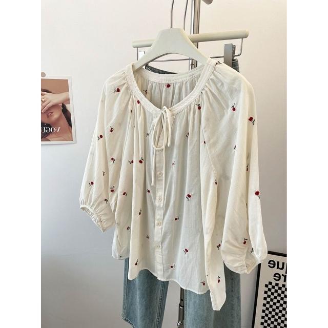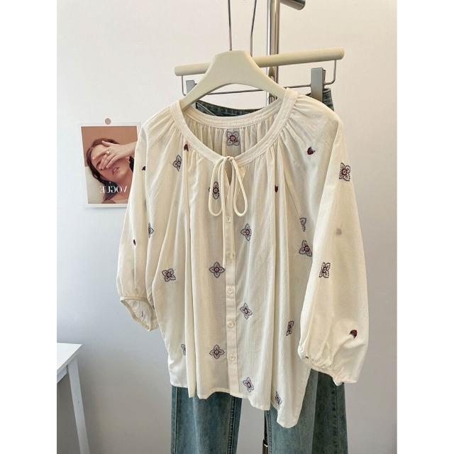 Quality生活 法式溫柔花朵刺繡圓領系帶襯衫女夏薄款寬松中袖洋氣小衫 3be