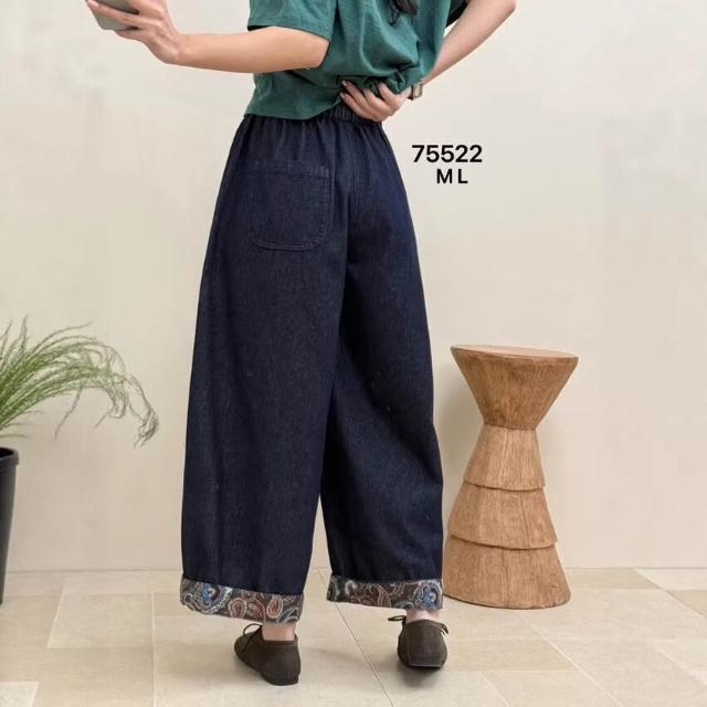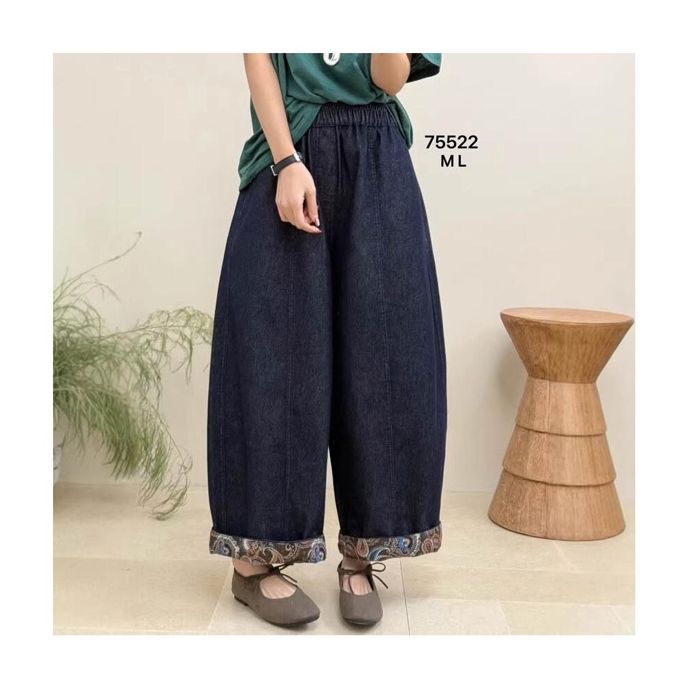 Quality生活 翻邊牛仔褲女 2026春新款松緊腰文藝復古寬松大碼九分闊腿褲75522 6ba