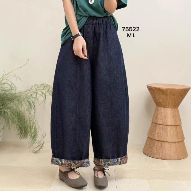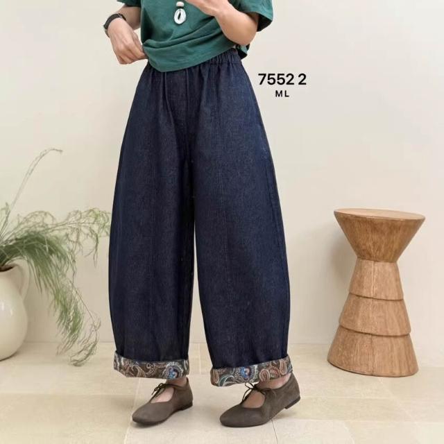 Quality生活 翻邊牛仔褲女 2026春新款松緊腰文藝復古寬松大碼九分闊腿褲75522 6ba