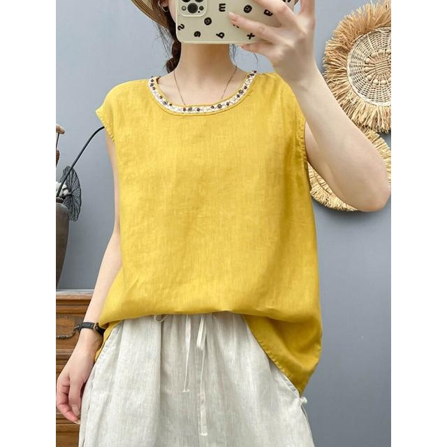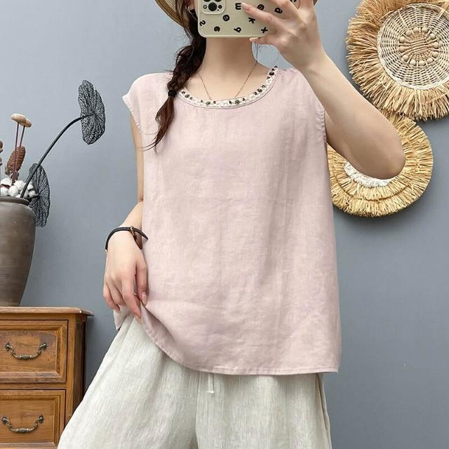Quality生活 2026新款夏季亞麻圓領小衫女復古文藝氣質襯衣寬松襯衫女裝潮流 ecf
