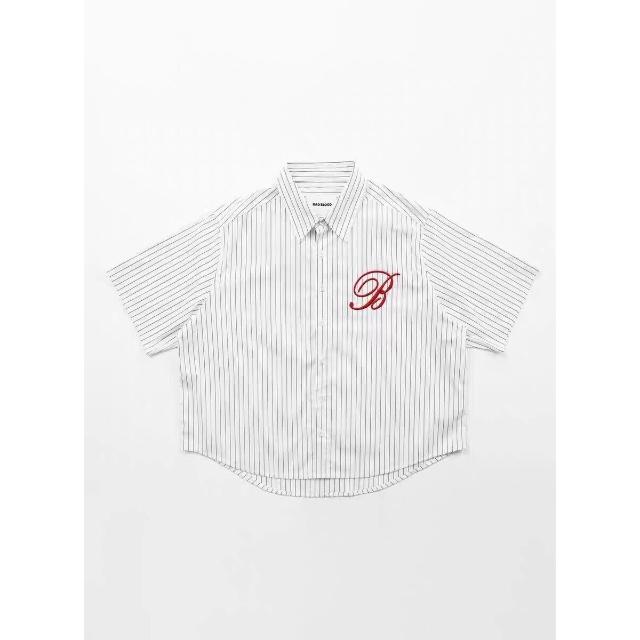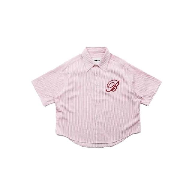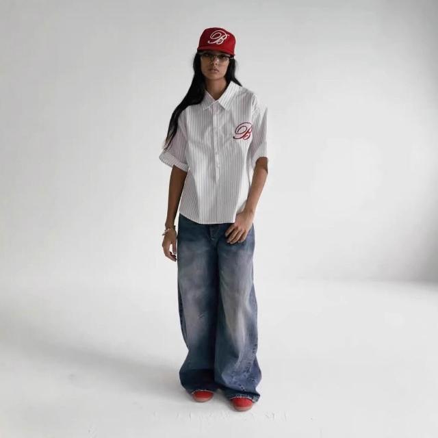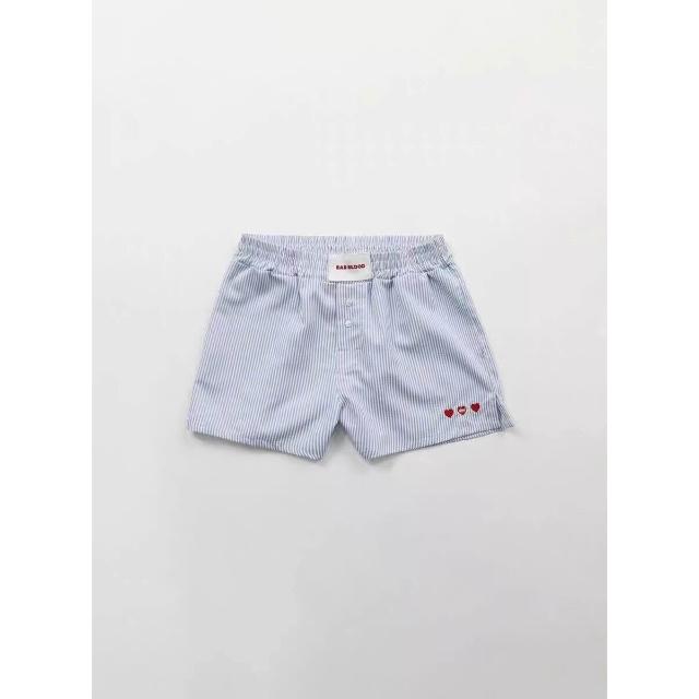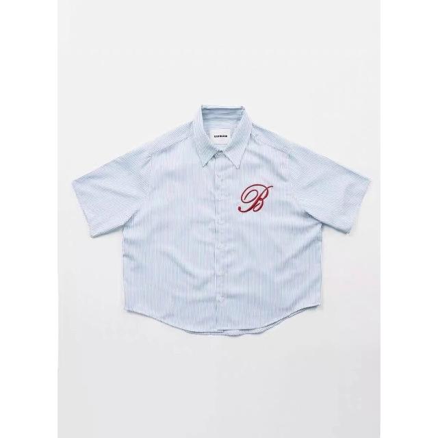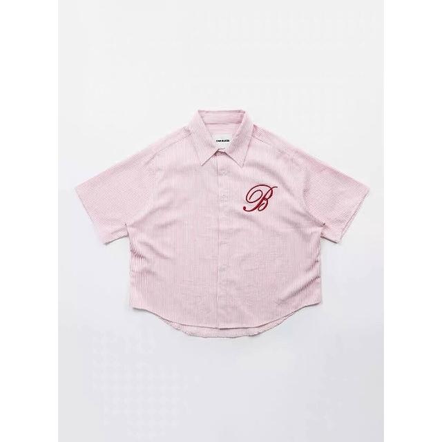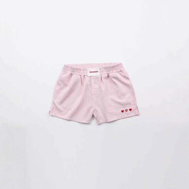 Quality生活 美式復古翻領條紋短袖襯衫寬松休閑刺繡短褲上衣男女套裝 55f