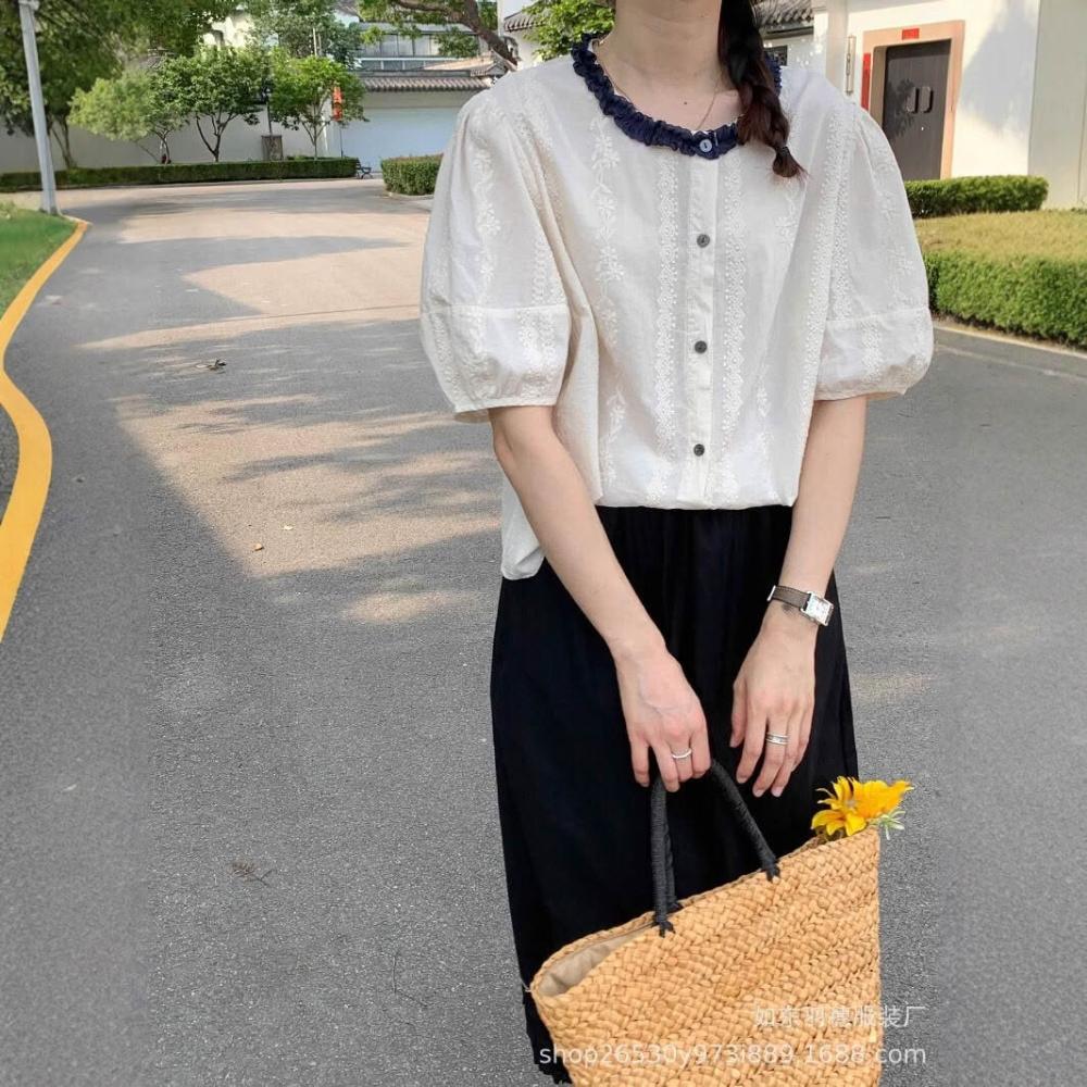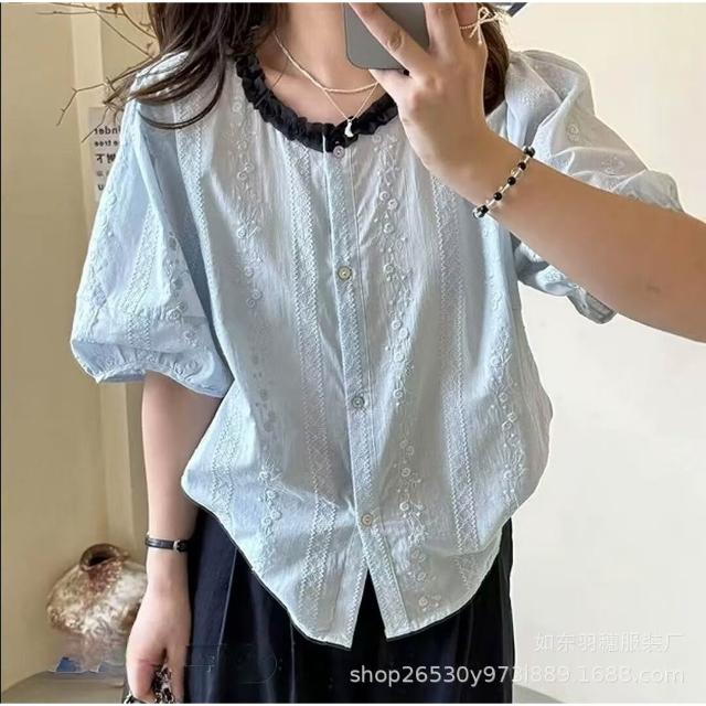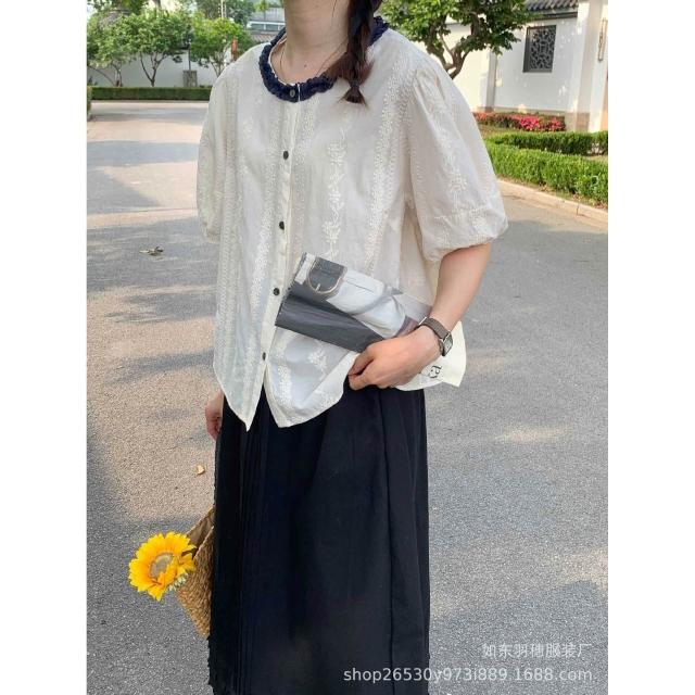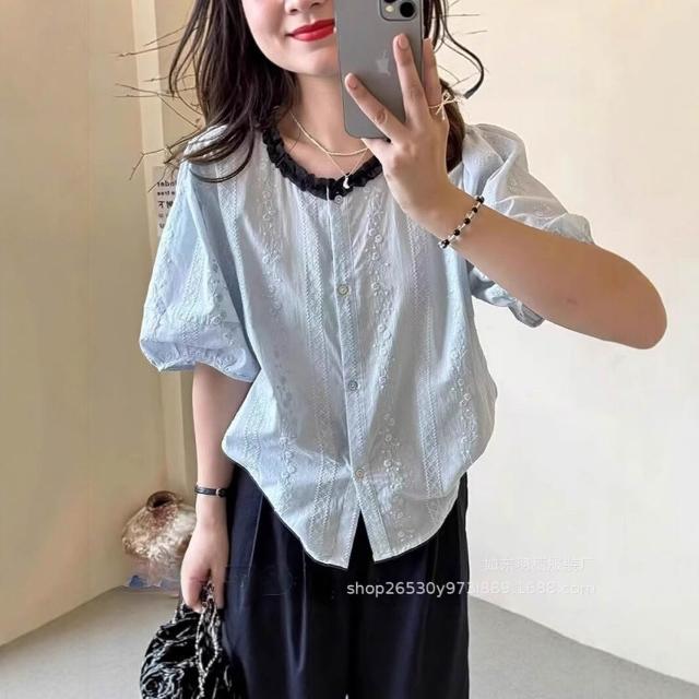 Quality生活 純棉刺繡小衫女夏季設計感木耳邊圓領簡韓系寬松百搭短袖襯衫K29 518