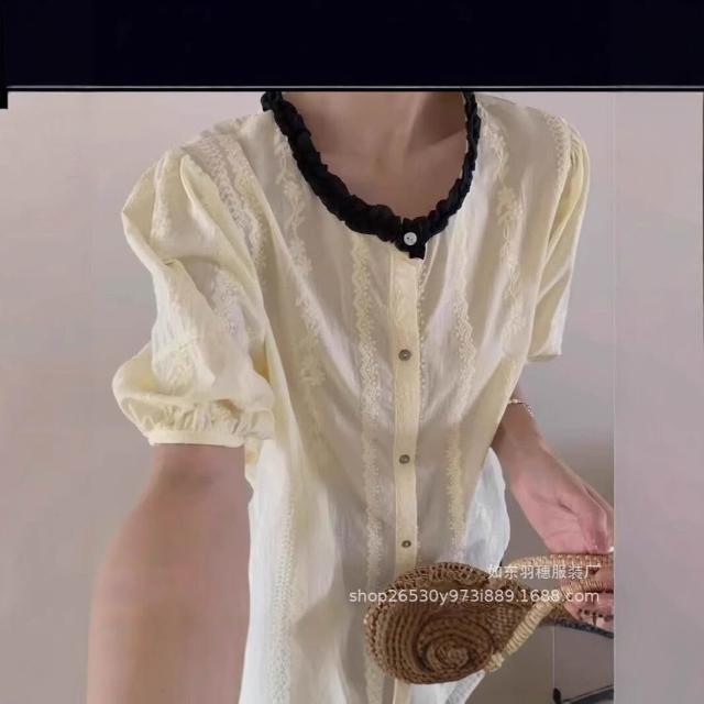 Quality生活 純棉刺繡小衫女夏季設計感木耳邊圓領簡韓系寬松百搭短袖襯衫K29 518