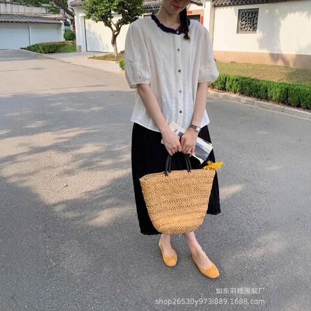 Quality生活 純棉刺繡小衫女夏季設計感木耳邊圓領簡韓系寬松百搭短袖襯衫K29 518