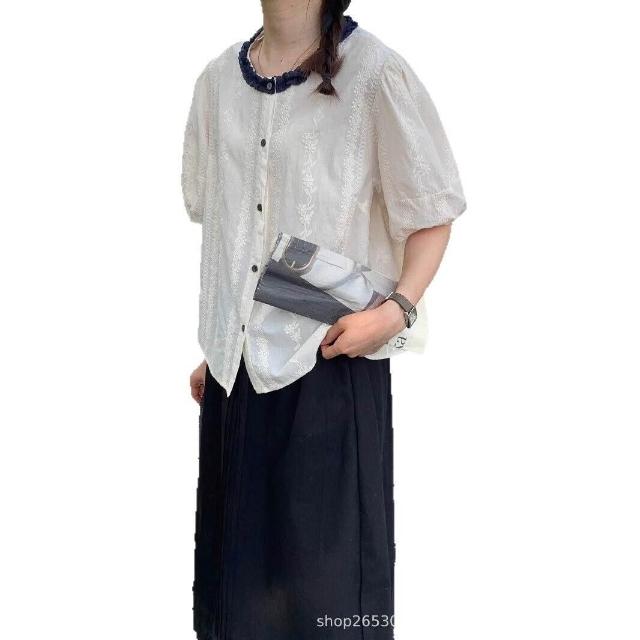 Quality生活 純棉刺繡小衫女夏季設計感木耳邊圓領簡韓系寬松百搭短袖襯衫K29 518