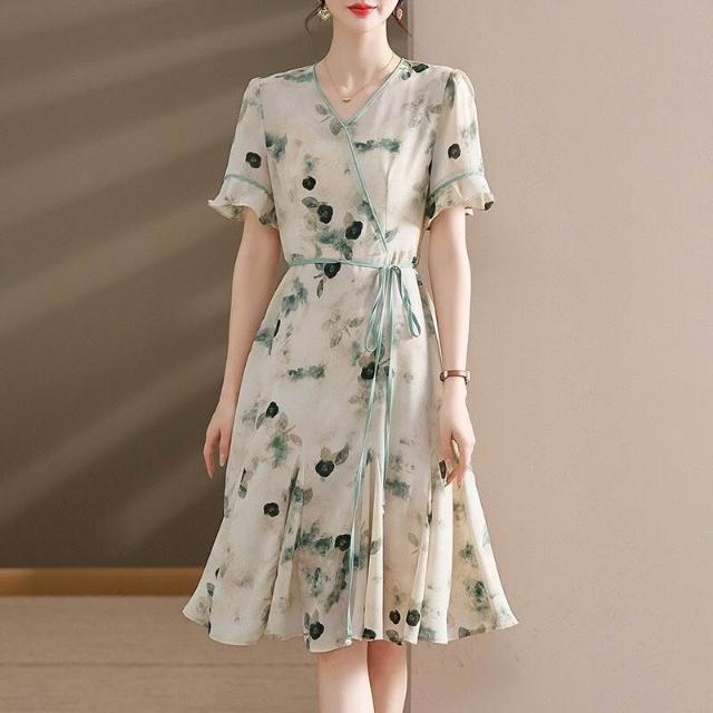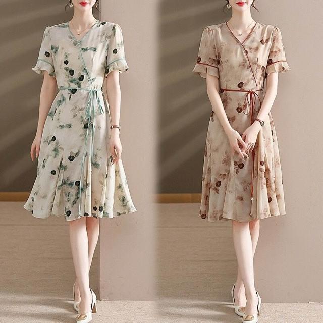 Quality生活 媽媽夏裝v領連衣裙洋氣印花裙子氣質優雅收腰中長裙潮 d74