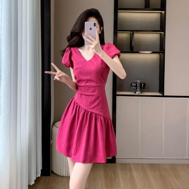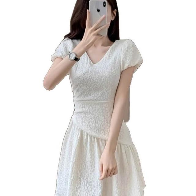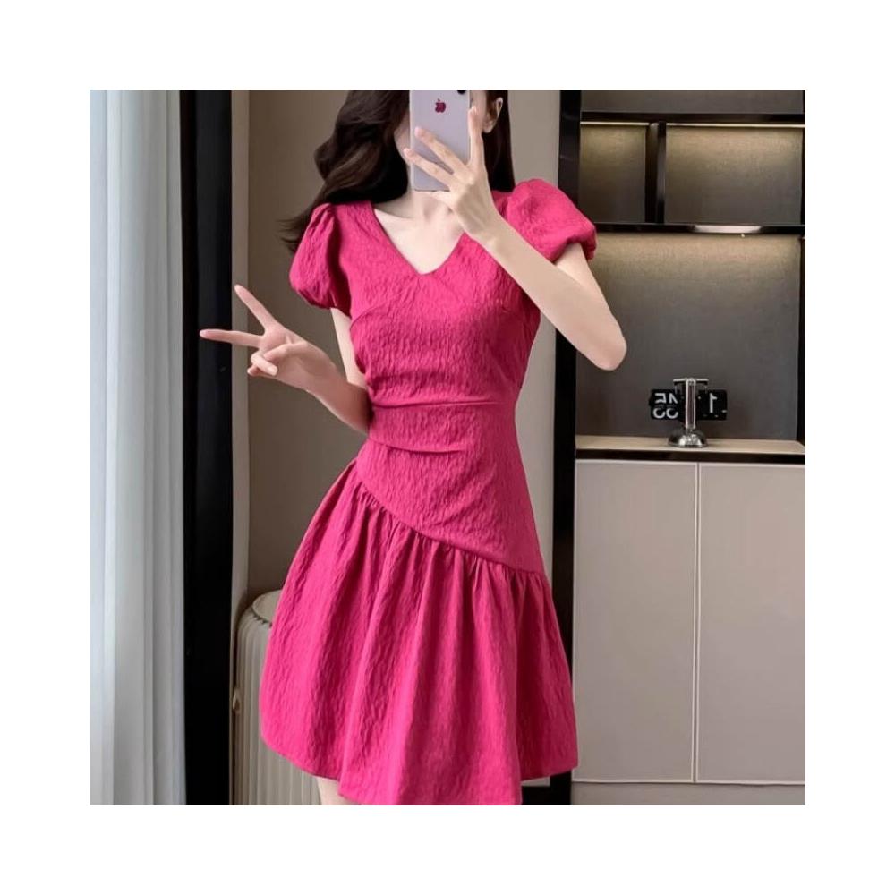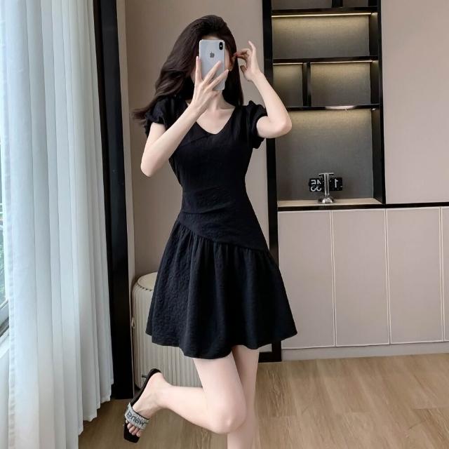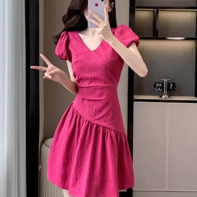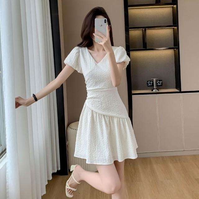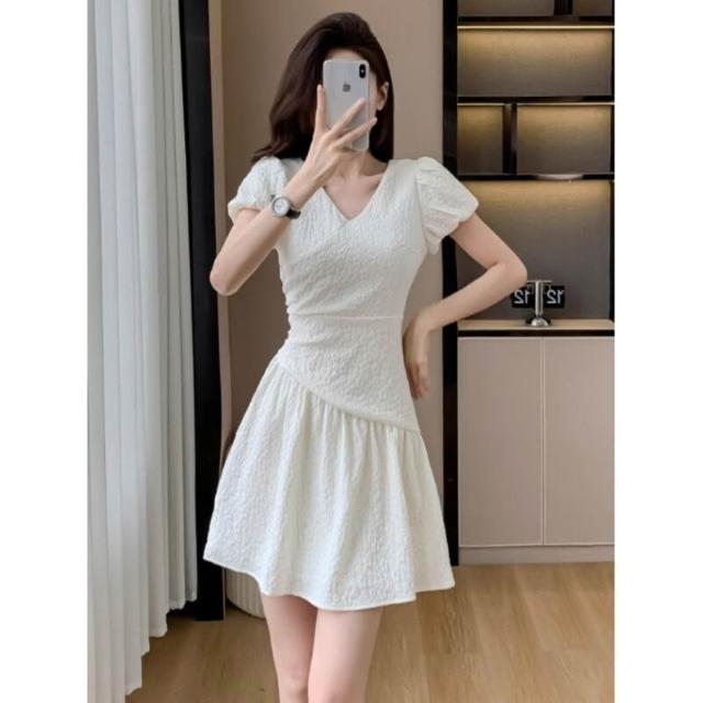 Quality生活 夏季新款v領泡泡袖連衣裙女設計感褶皺收腰肌理感a字裙法式短裙潮 8ce