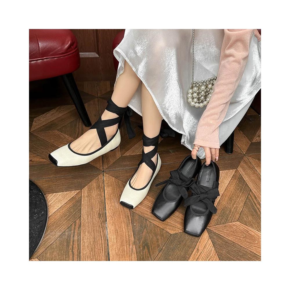 Quality生活 法式復古綁帶拼色平底單鞋女2026春季新款真皮綁帶方頭芭蕾舞鞋女 ce9
