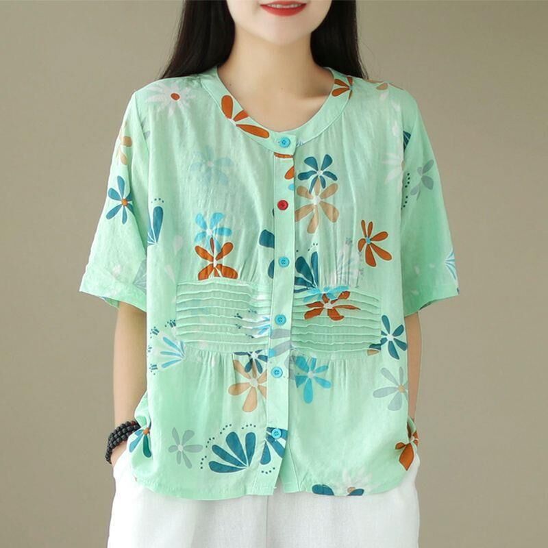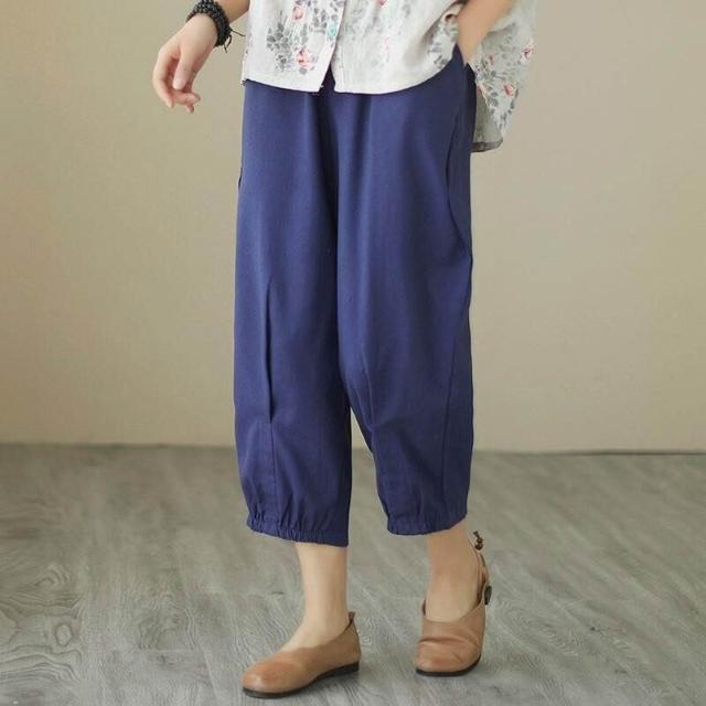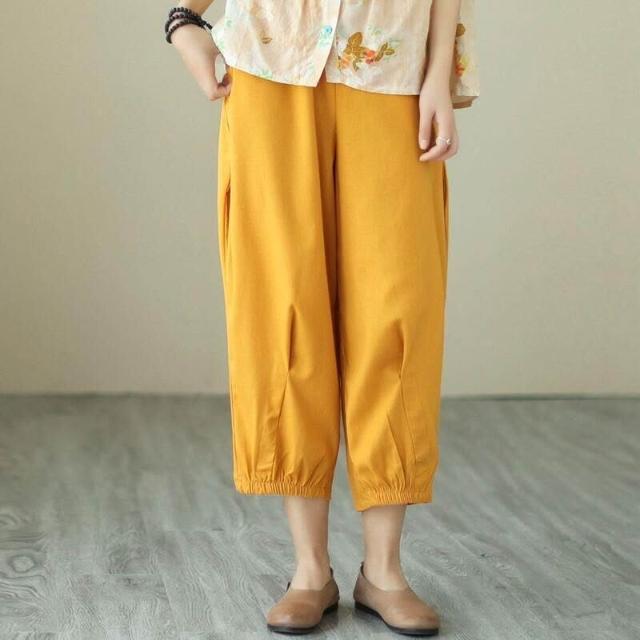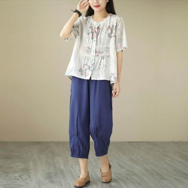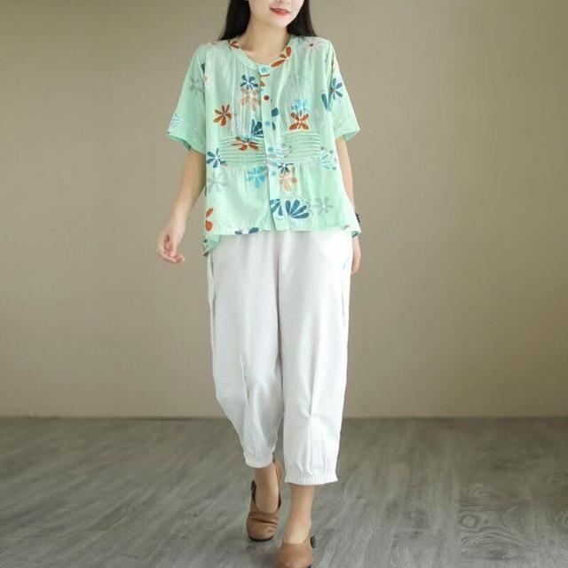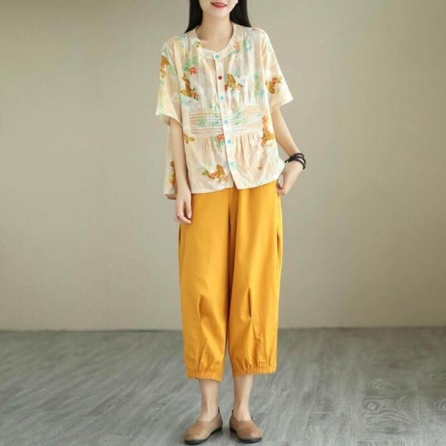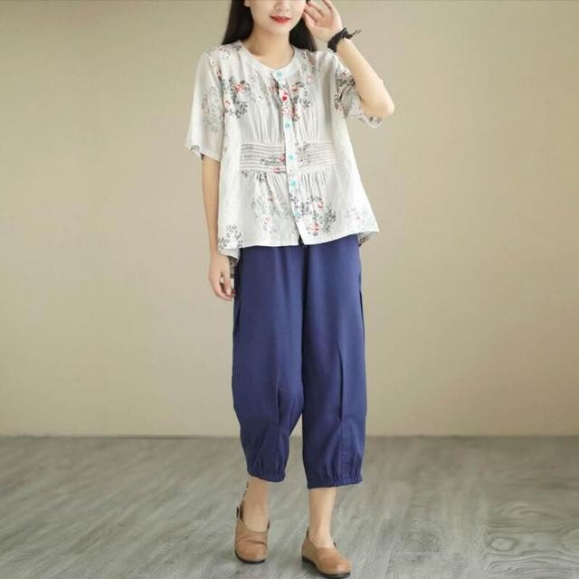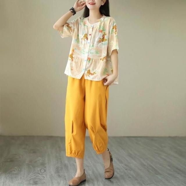 Quality生活 單件/套裝 夏季新款韓版大碼文藝印花短袖燈籠褲兩件套棉麻套裝女 383