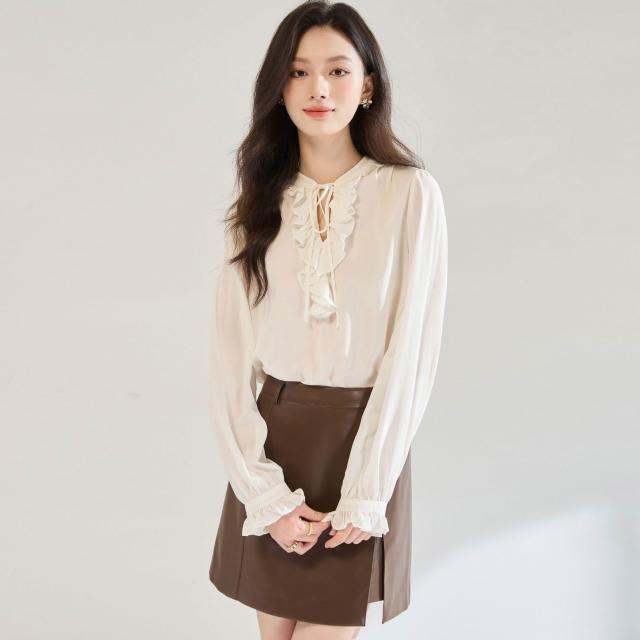 26春季法式荷葉邊系帶設計感V領白色襯衫泡泡袖浪漫天絲小衫60 df2