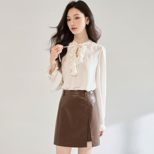 26春季法式荷葉邊系帶設計感V領白色襯衫泡泡袖浪漫天絲小衫60 df2