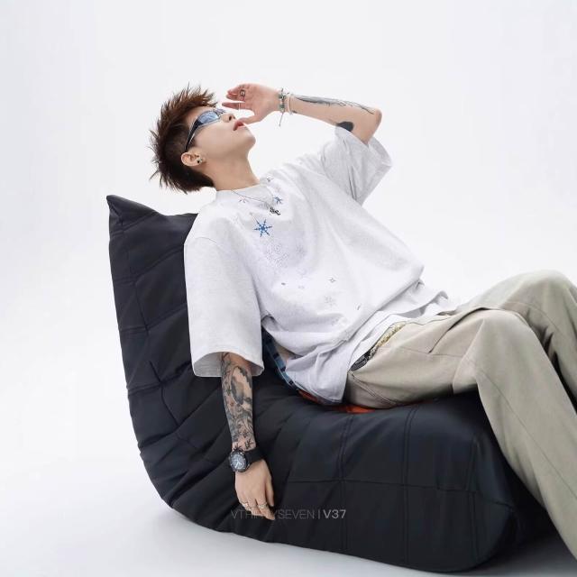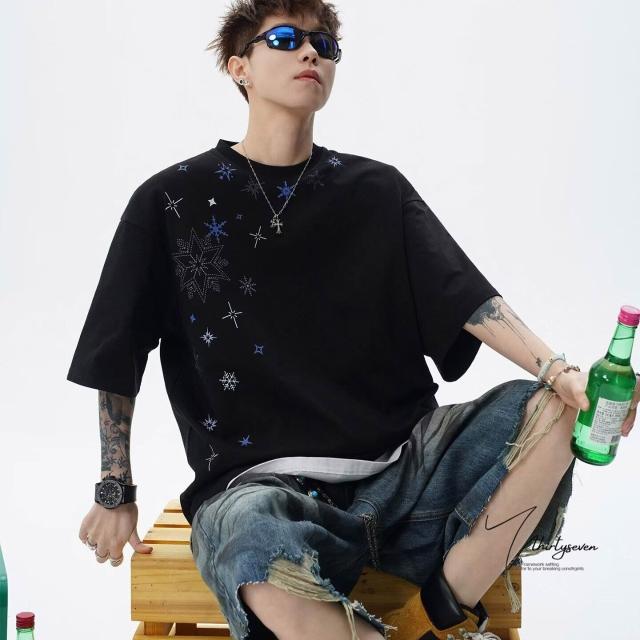 🚀虧本衝評&限時下殺🔥T恤 短袖T恤 短袖上衣 夏季男裝 星星雪花短袖T恤夏季男女高街重磅棉t恤寬鬆百搭美式情侶休閒