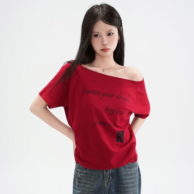 🚀虧本衝評&限時下殺🔥短袖T恤 夏季女裝 純欲斜領露肩設計感短袖T恤女2026年夏季新款寬鬆慵懶風上衣