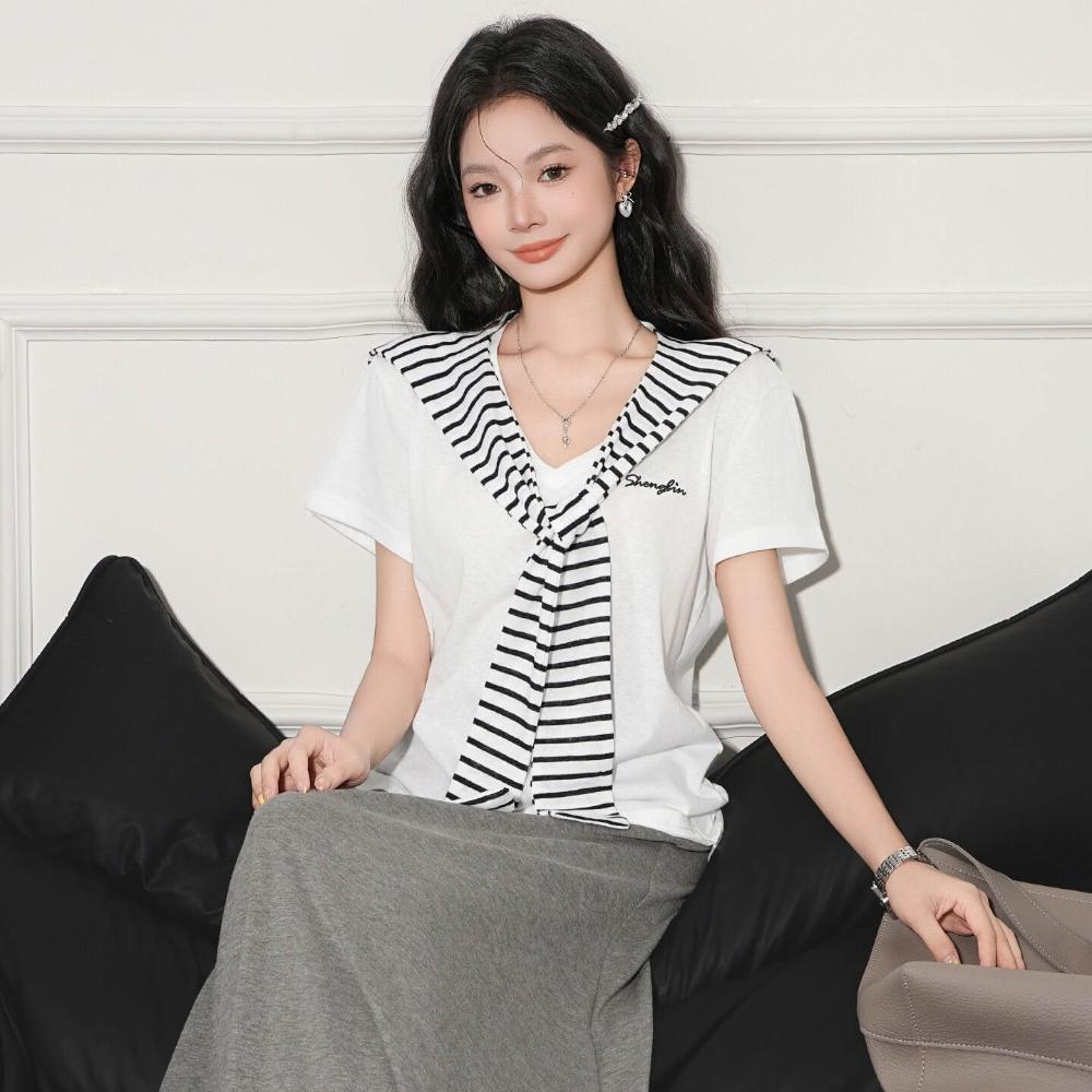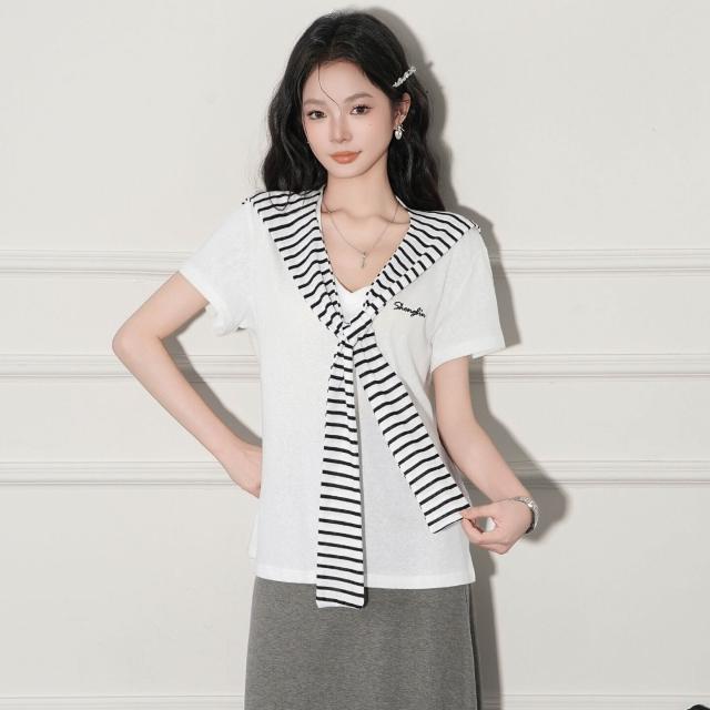🚀虧本衝評&限時下殺🔥短袖T恤 夏季女裝 白色v領條紋披肩兩件套短袖t恤女夏季海軍領設計感減齡上衣