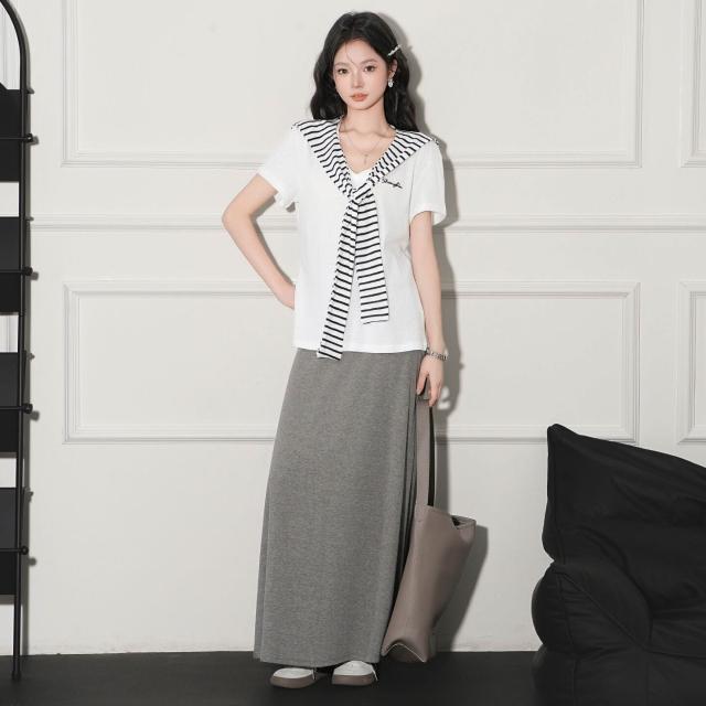 🚀虧本衝評&限時下殺🔥短袖T恤 夏季女裝 白色v領條紋披肩兩件套短袖t恤女夏季海軍領設計感減齡上衣