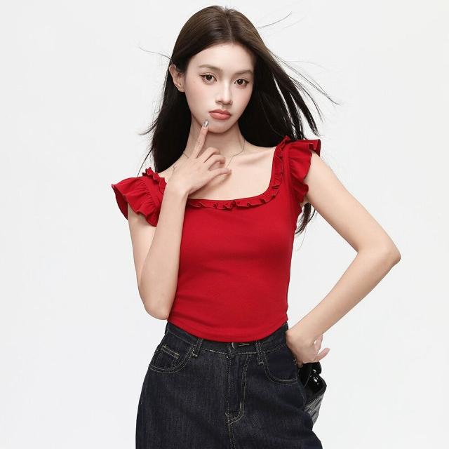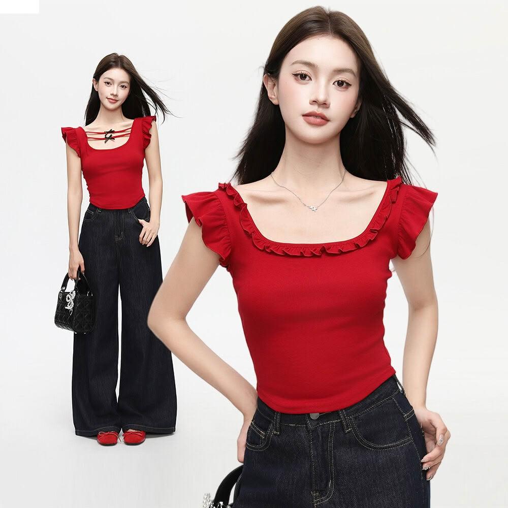 🚀虧本衝評&限時下殺🔥短袖T恤 夏季女裝 紅色正肩方領木耳邊短袖T恤女夏小眾設計辣妹小個子高腰上衣