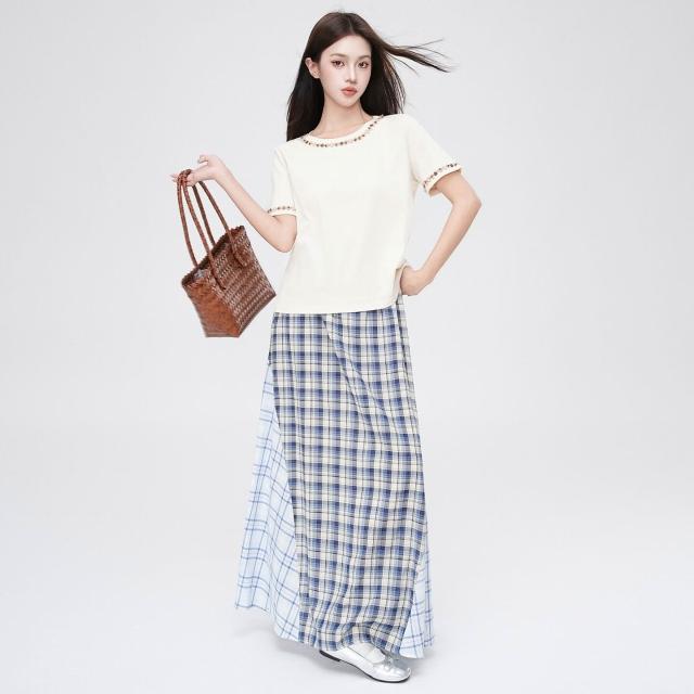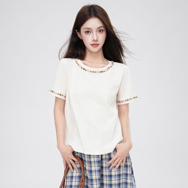 🚀虧本衝評&限時下殺🔥短袖T恤 夏季女裝 奶白杏圓領旅遊風獨特釘珠正肩短袖t恤女2026初夏設計感上衣