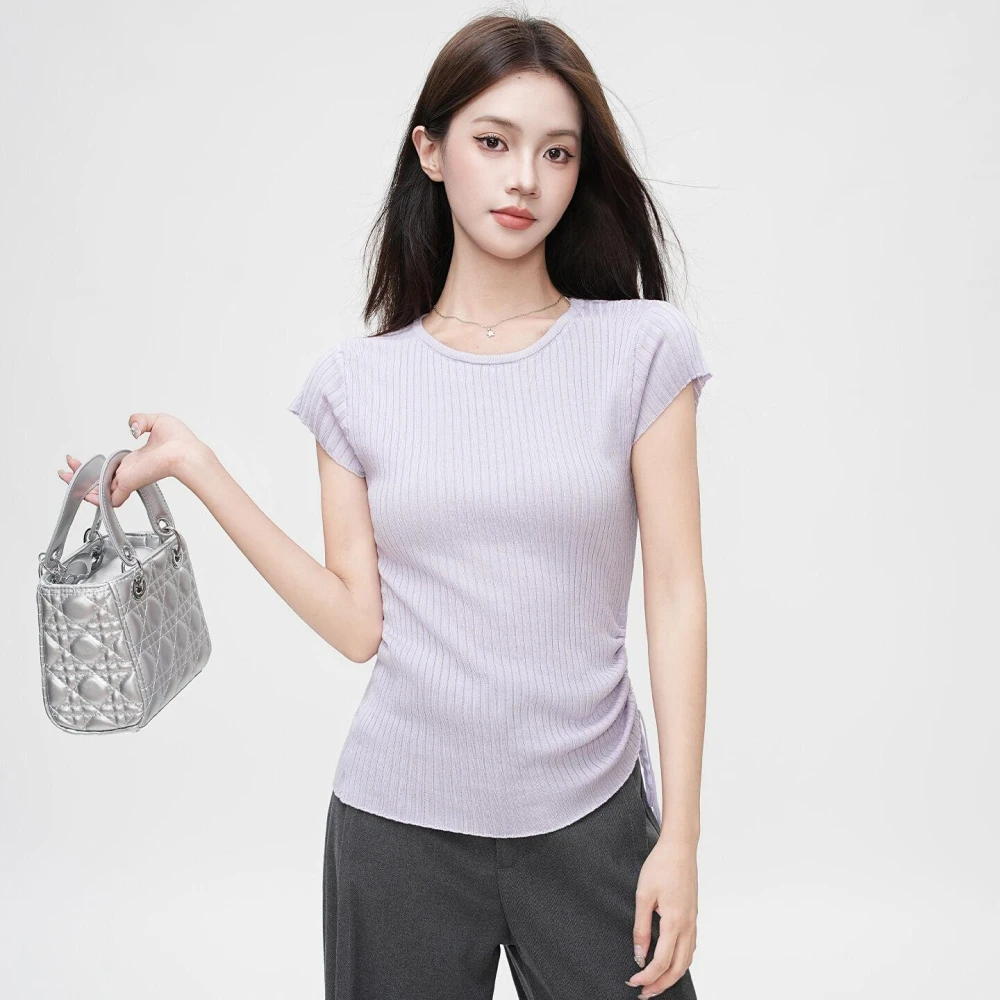 🚀虧本衝評&限時下殺🔥短袖T恤 夏季女裝 紫色穿搭絕美圓領針織短袖T恤女夏季薄款舒適褶皺收腰上衣