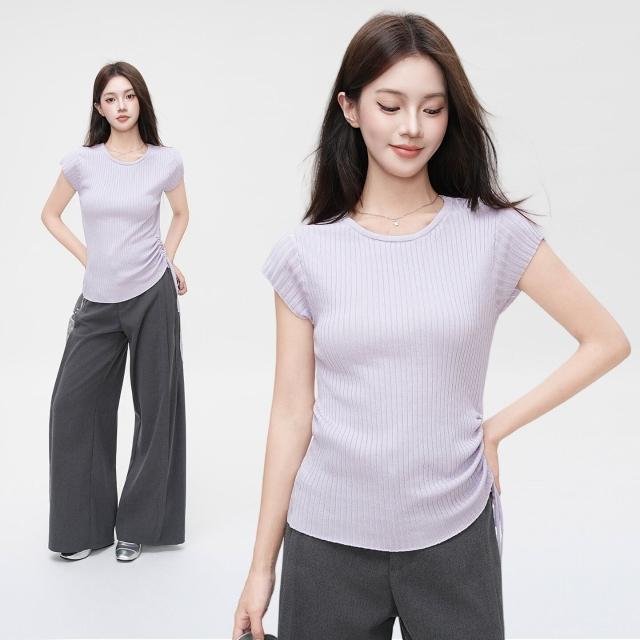 🚀虧本衝評&限時下殺🔥短袖T恤 夏季女裝 紫色穿搭絕美圓領針織短袖T恤女夏季薄款舒適褶皺收腰上衣