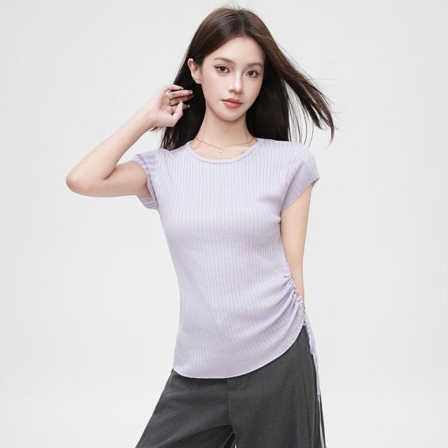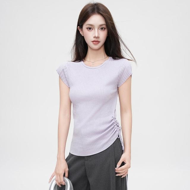 🚀虧本衝評&限時下殺🔥短袖T恤 夏季女裝 紫色穿搭絕美圓領針織短袖T恤女夏季薄款舒適褶皺收腰上衣