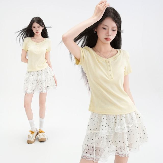 🚀虧本衝評&限時下殺🔥短袖T恤 夏季女裝 多巴胺奶黃色圓領正肩短袖t恤亨利衫女2026夏季修身短款上衣