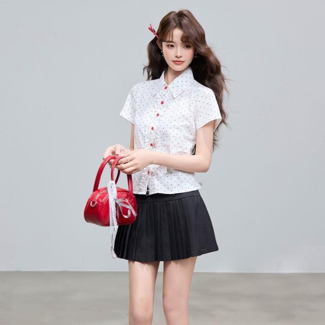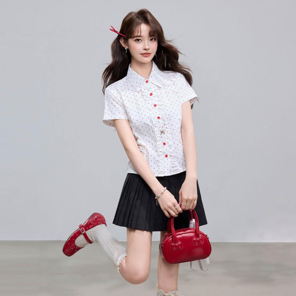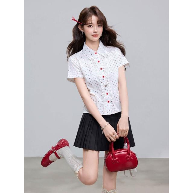 🚀虧本衝評&限時下殺🔥短袖T恤 夏季女裝 紅色波點poIo領正肩短袖紐扣襯衫女木耳邊掐腰顯瘦翻領上衣夏