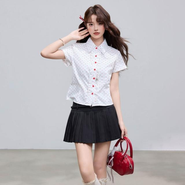 🚀虧本衝評&限時下殺🔥短袖T恤 夏季女裝 紅色波點poIo領正肩短袖紐扣襯衫女木耳邊掐腰顯瘦翻領上衣夏