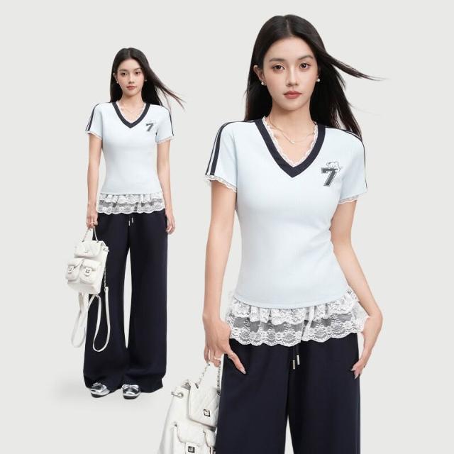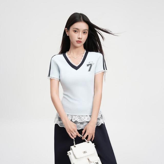 🚀虧本衝評&限時下殺🔥短袖T恤 夏季女裝 蕾絲拼接印花V領正肩短袖T恤女裝夏新款淺藍色修身運動上衣