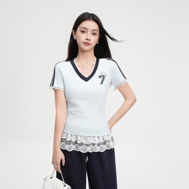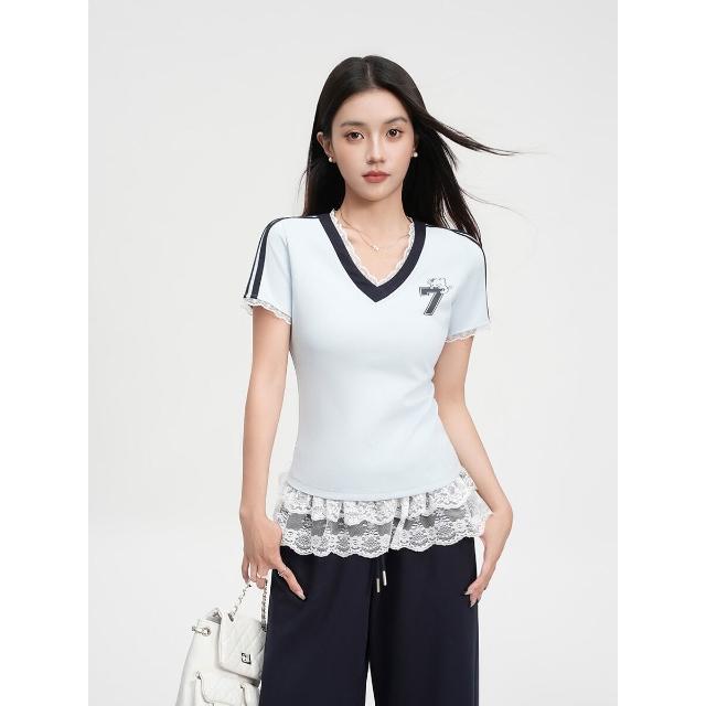 🚀虧本衝評&限時下殺🔥短袖T恤 夏季女裝 蕾絲拼接印花V領正肩短袖T恤女裝夏新款淺藍色修身運動上衣